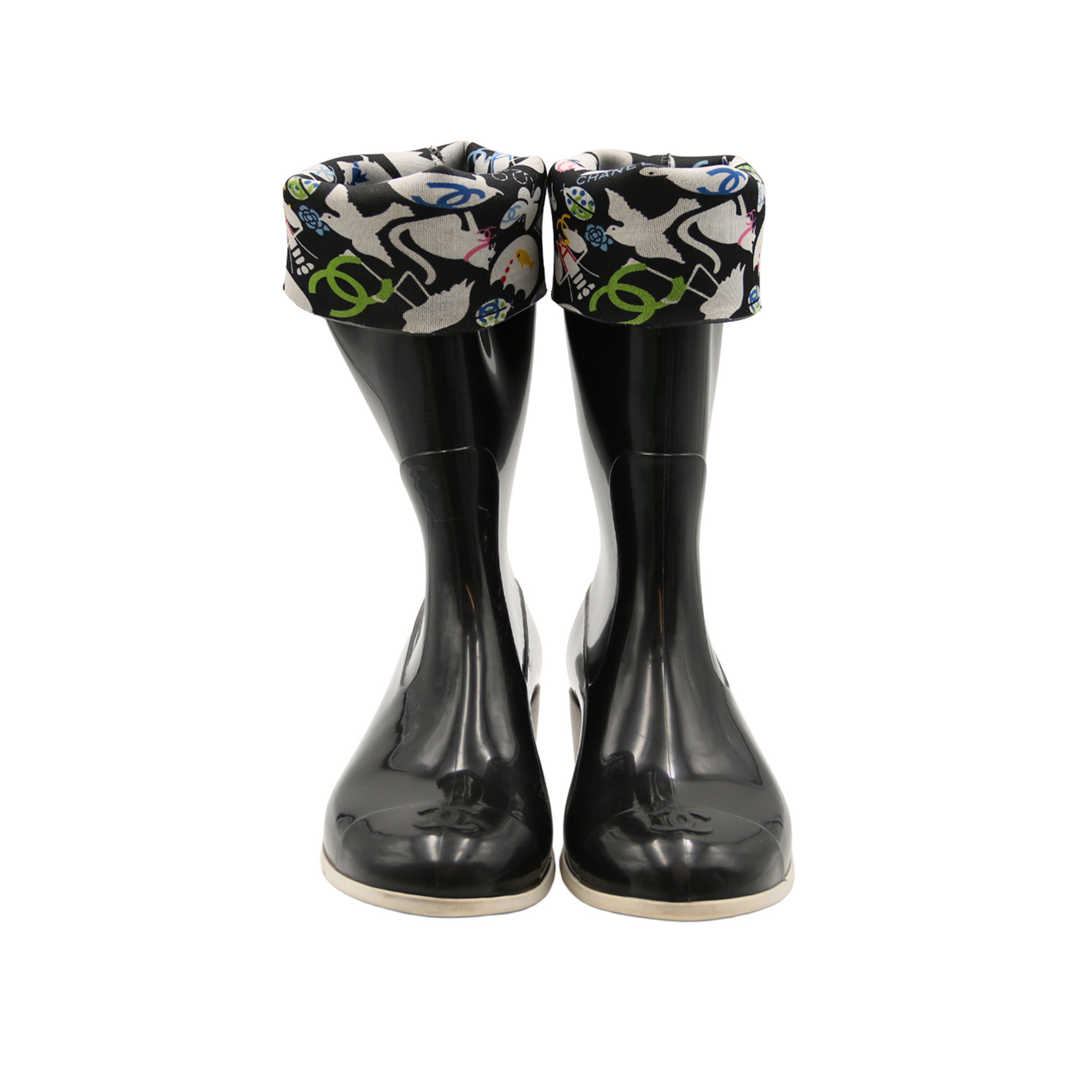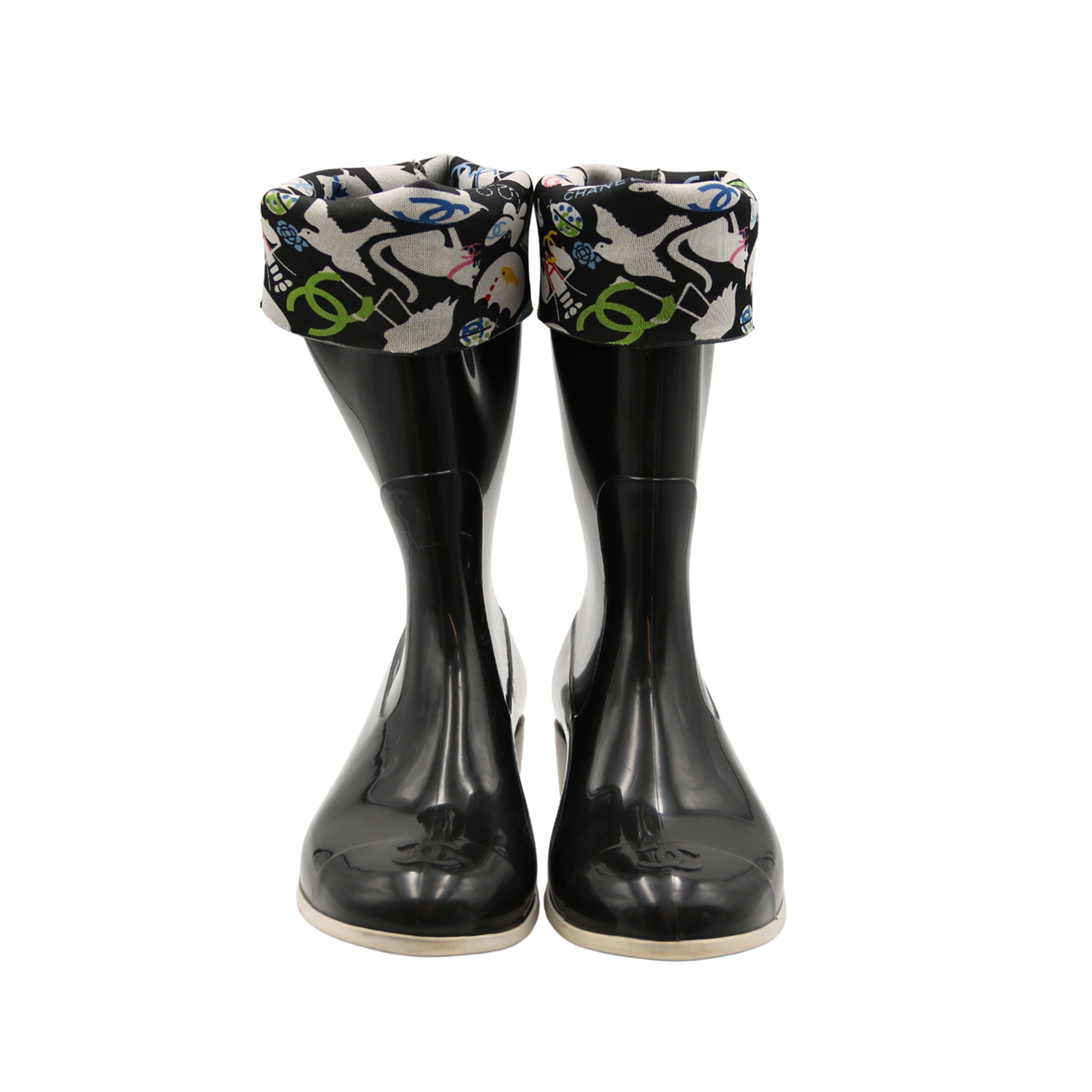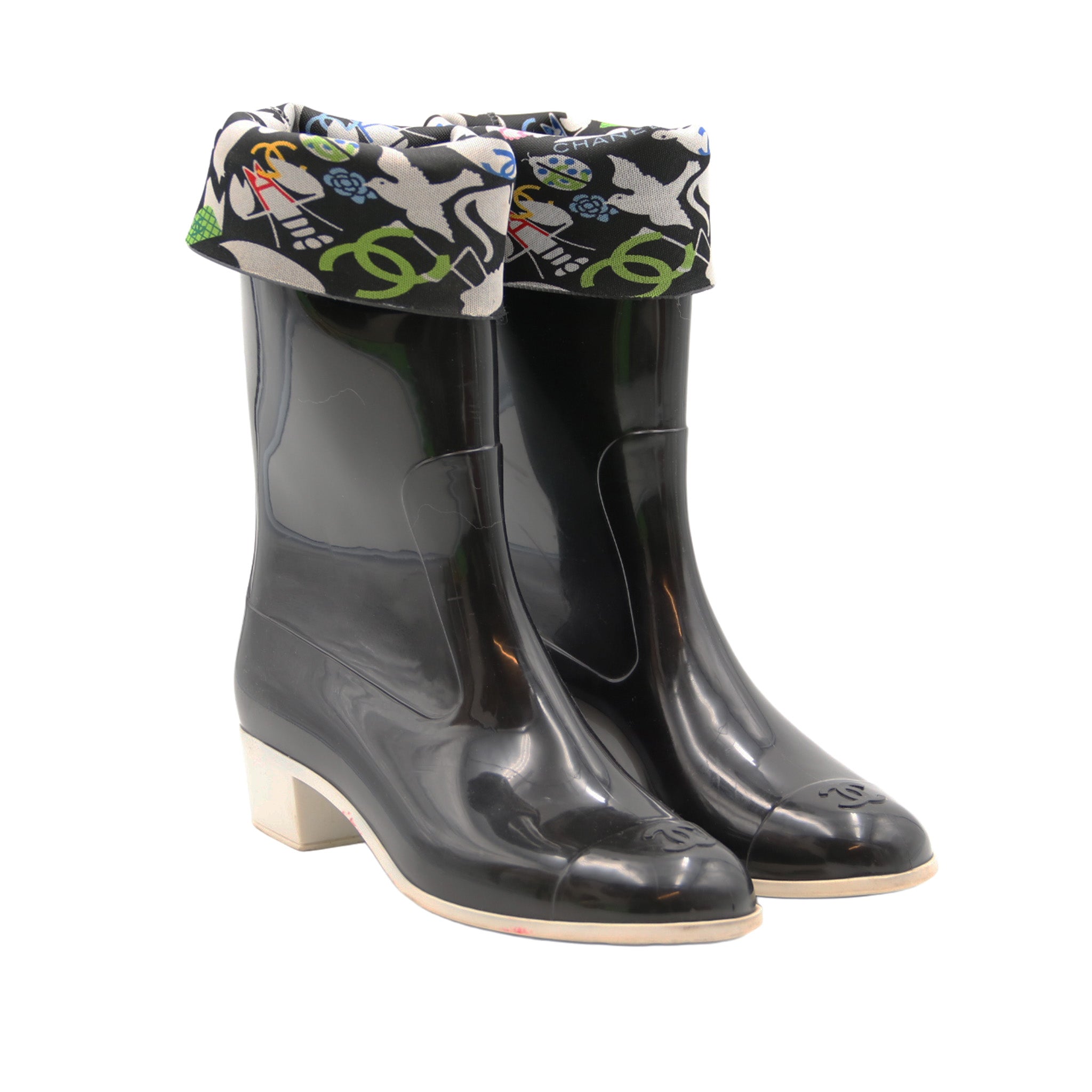 Ces bottes de pluie CHANEL revisitent l’essentiel utilitaire avec l’élégance emblématique de la Maison. Confectionnées en caoutchouc noir brillant, elles se distinguent par leur bout embossé du double C et leur revers en tissu imprimé multicolore, signature graphique et audacieuse. Le talon bloc clair apporte une touche contemporaine tout en assurant confort et stabilité. Un modèle iconique, parfait pour sublimer les journées pluvieuses avec style.