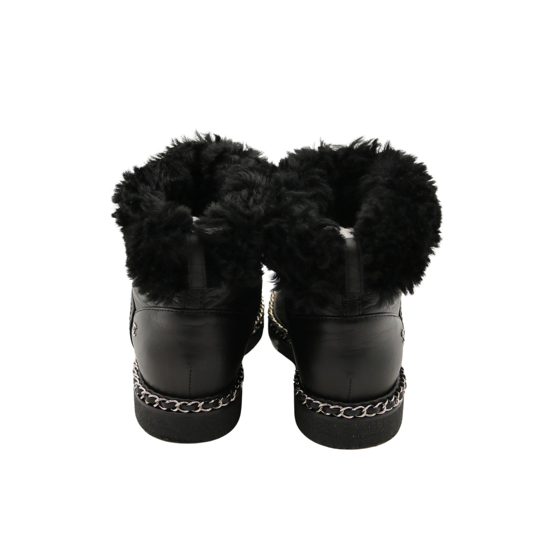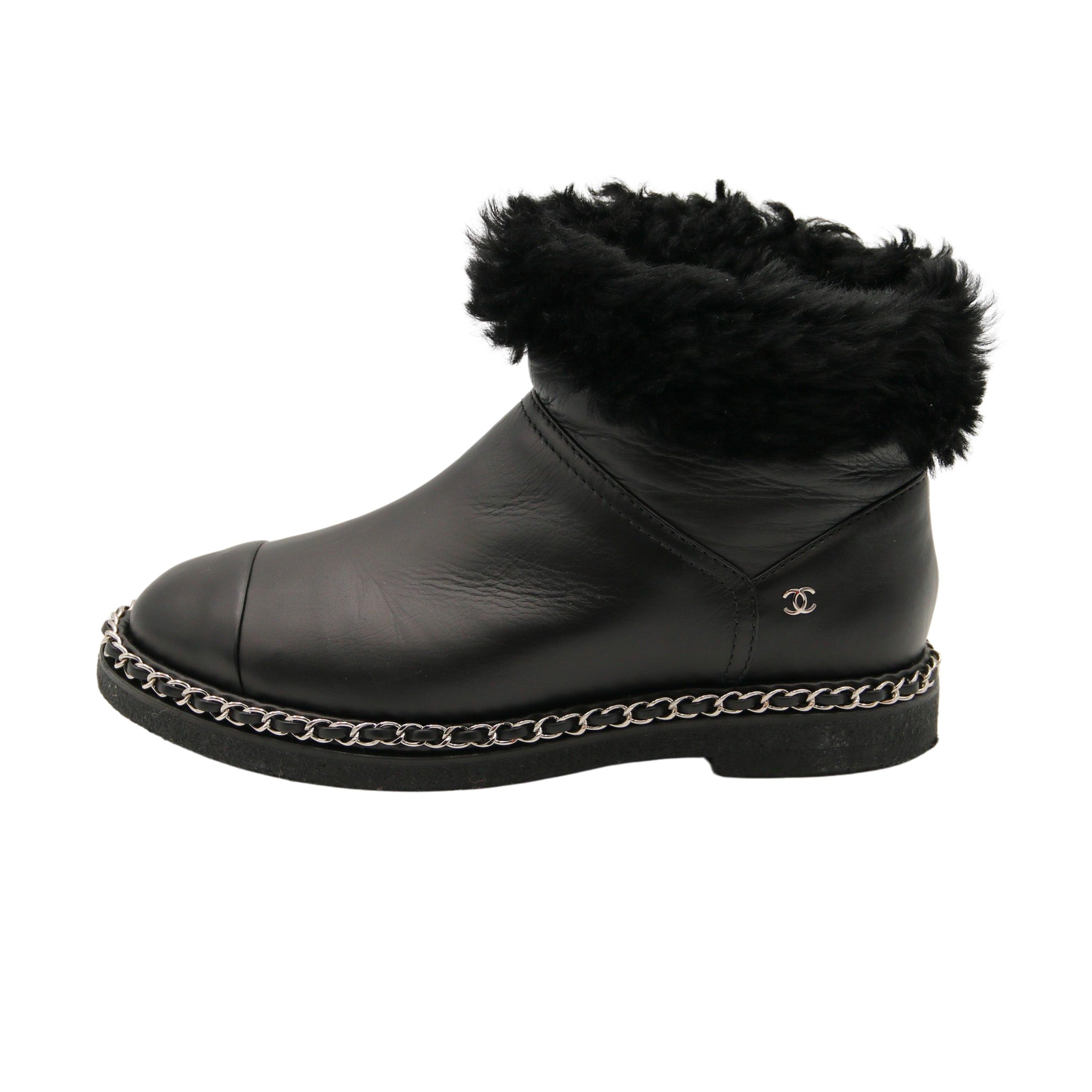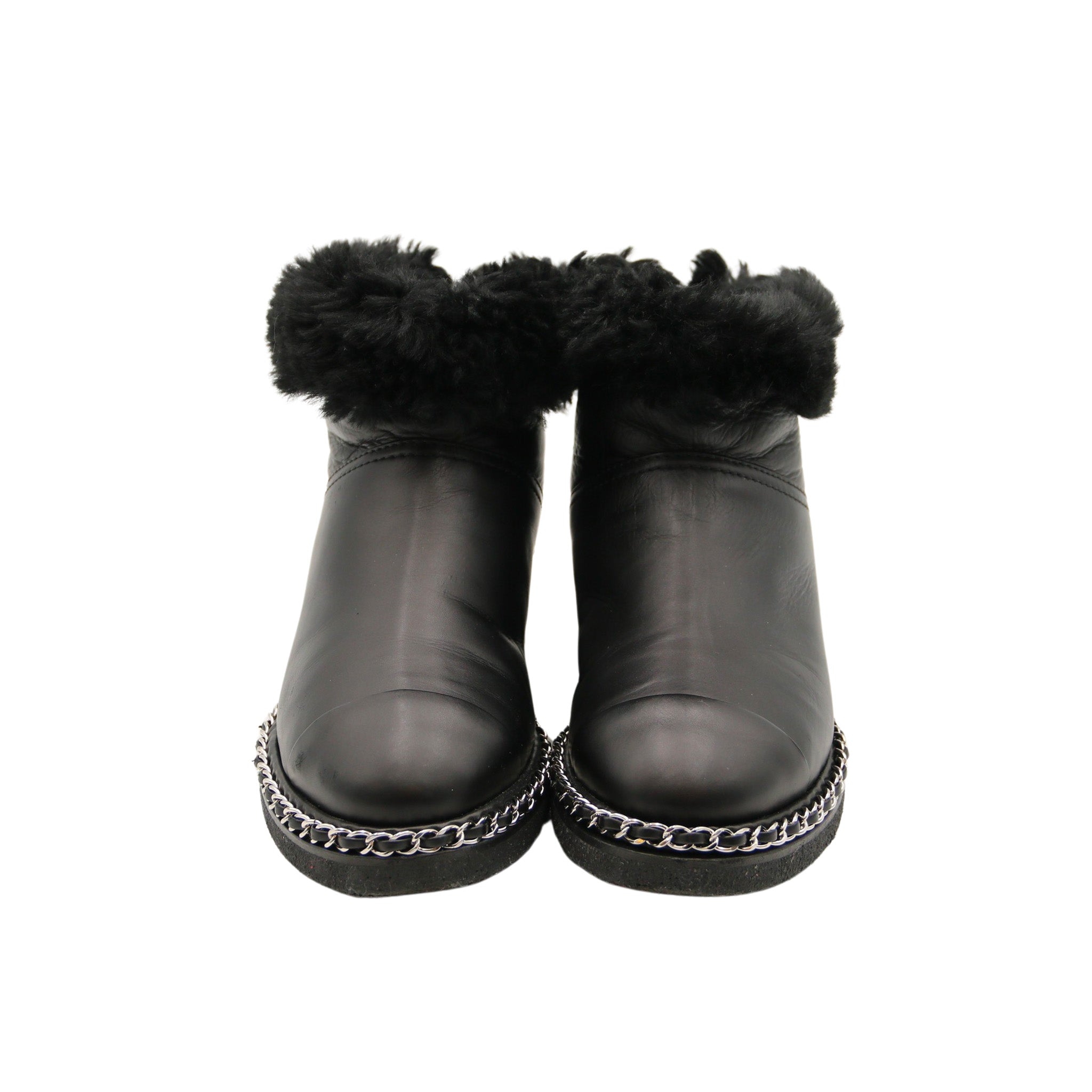 CHANEL – Bottine shearling & chaîne – Cuir noir / mouton