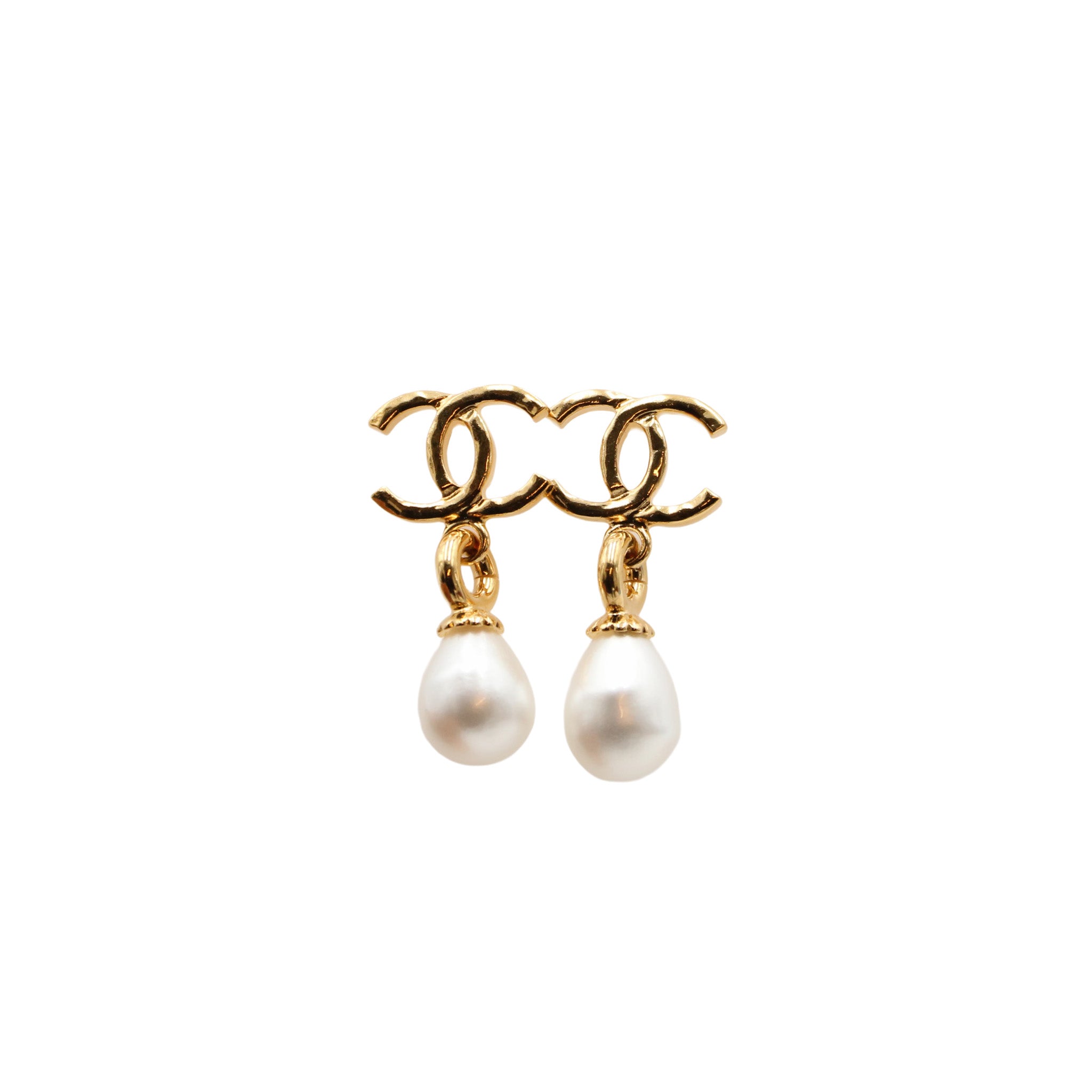 Boucles d’oreilles Chanel raffinées, composées d’un logo CC en métal doré et d’une perle goutte nacrée suspendue. Un classique intemporel qui illustre parfaitement l’élégance de la maison Chanel.
