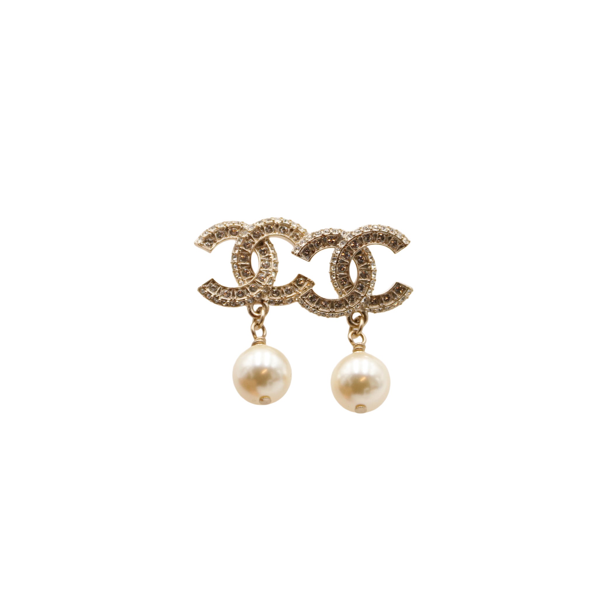 CHANEL – Boucles d’oreilles CC strass et perles pendantes – Collection 2018