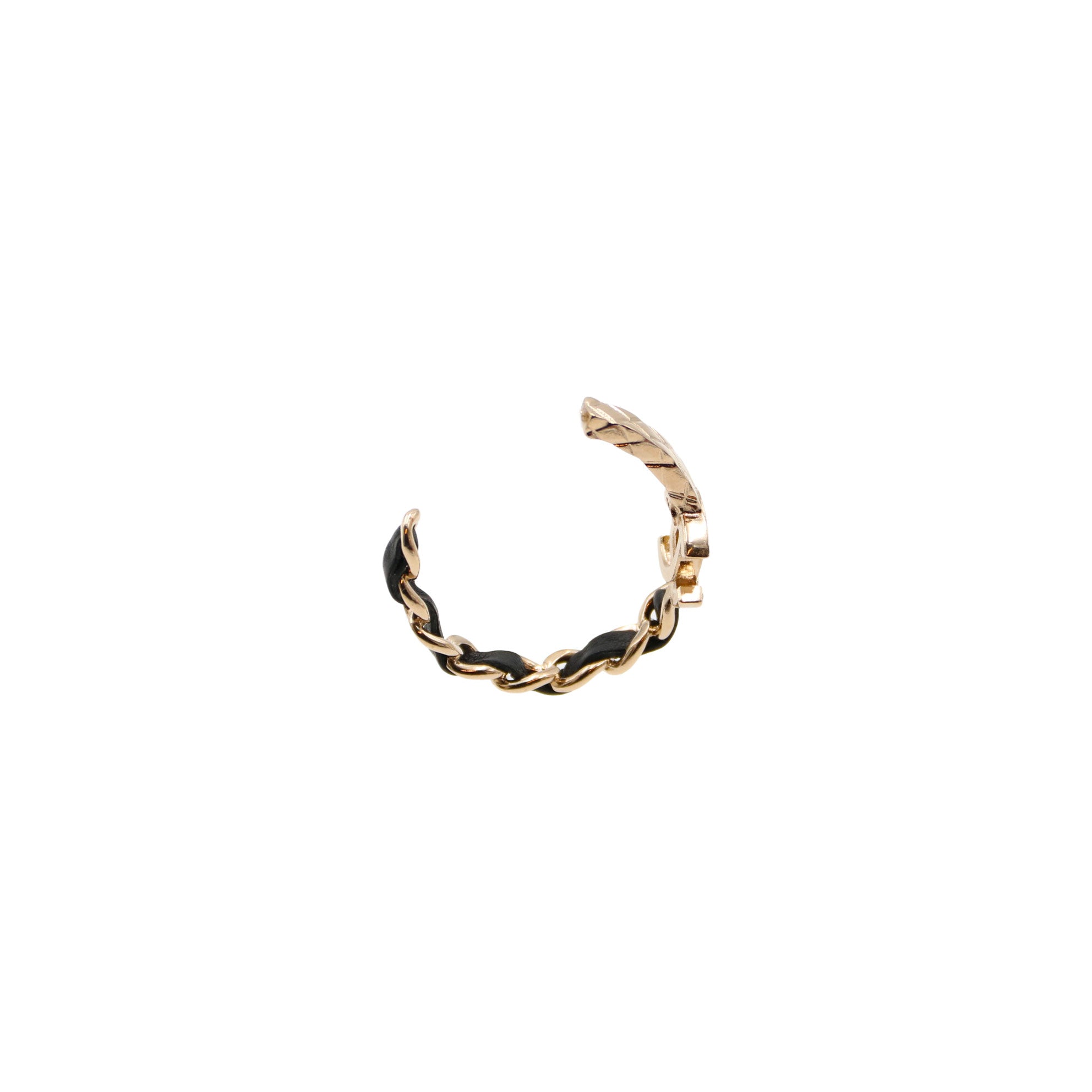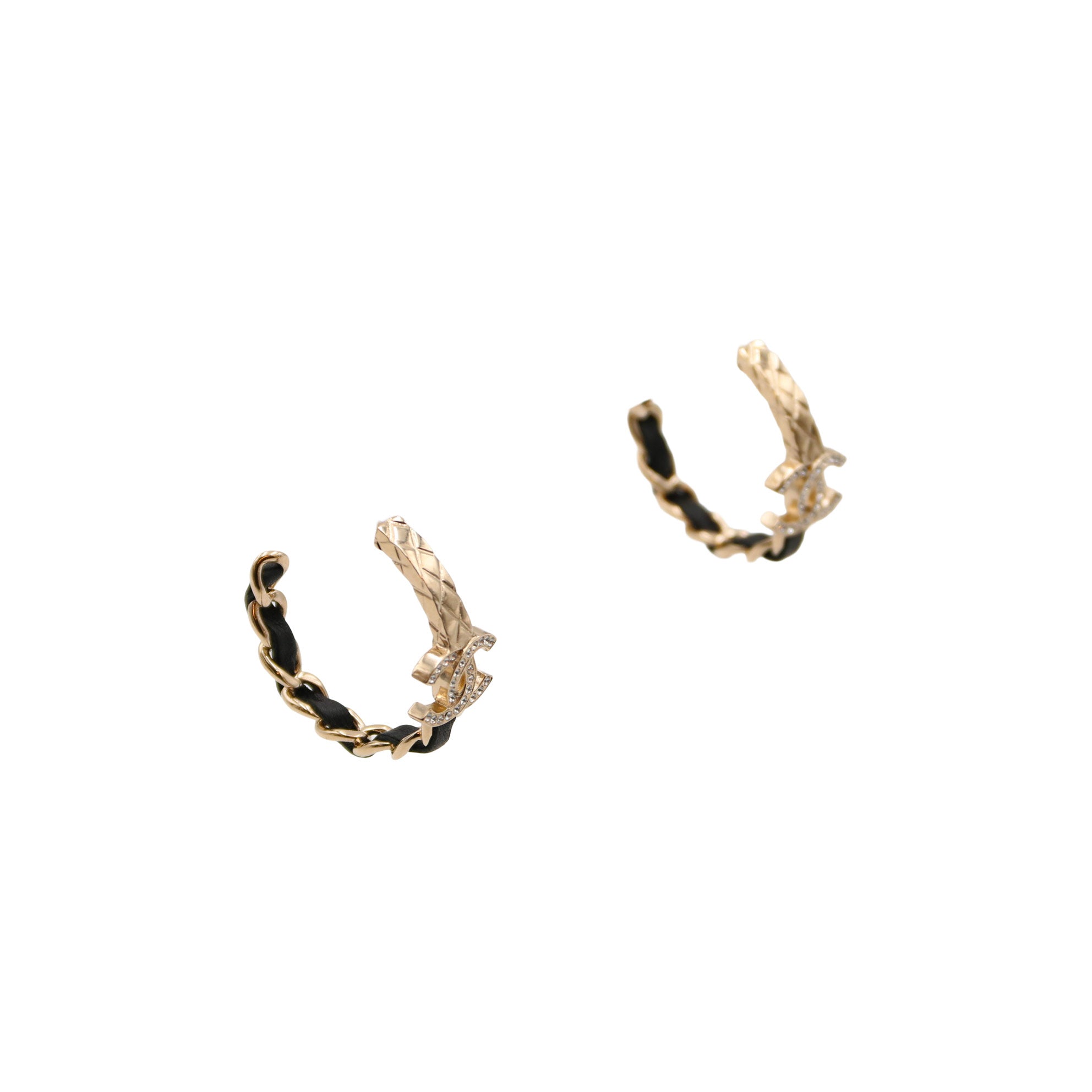Boucles d’oreilles Chanel (stamp A23, Automne 2023), réalisées en métal doré avec chaîne entrelacée de cuir noir, signature emblématique de la maison. Chaque créole est agrémentée d’un pendentif logo CC serti de strass scintillants pour une allure élégante et intemporelle.