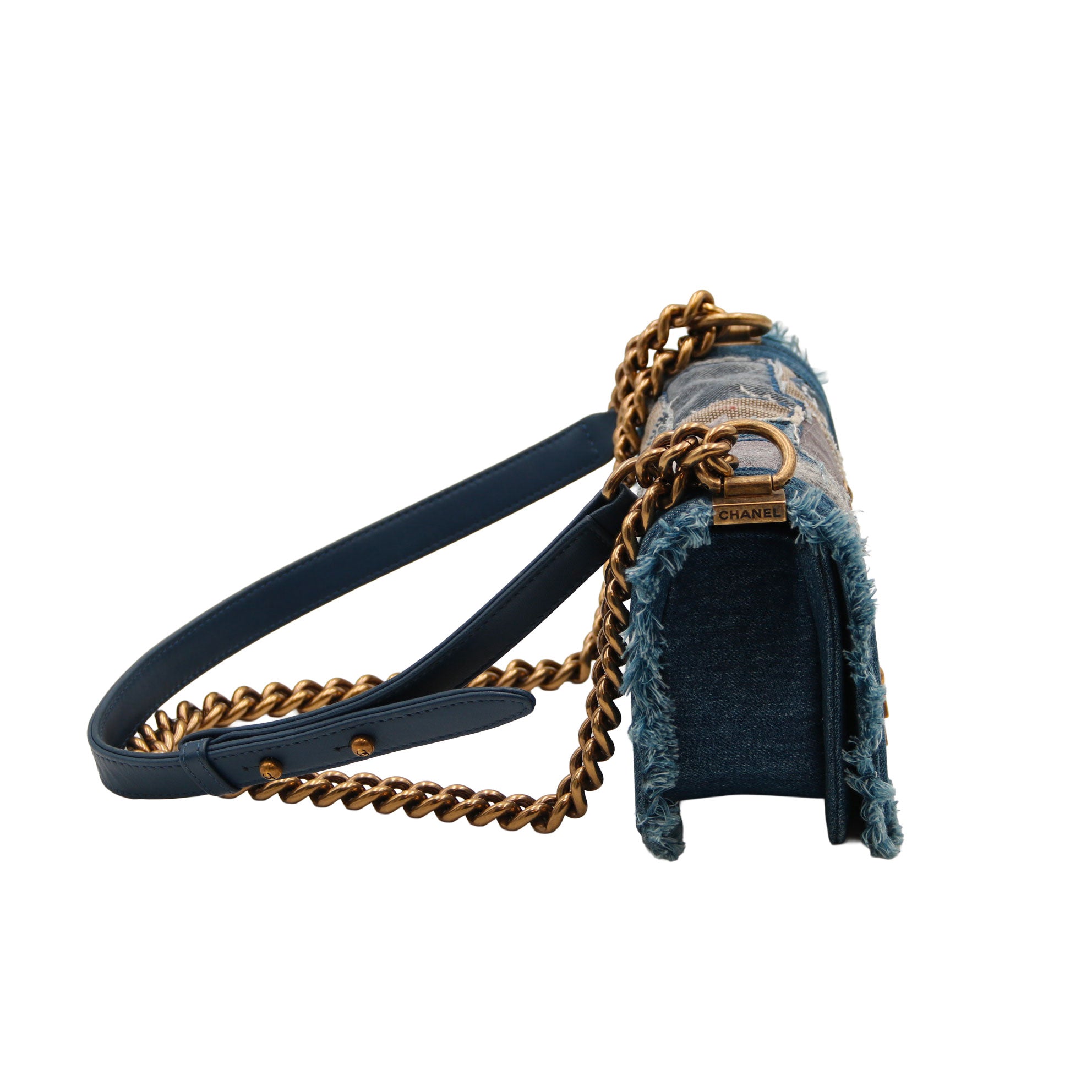 Édition spéciale de la Maison Chanel, ce Boy Bag est issu de la collection 2015-2016. Conçu en patchwork de denim et de toile, il se distingue par ses détails effilochés et son allure couture au style urbain. Son fermoir Boy en métal doré vieilli et sa chaîne entrelacée de cuir lui confèrent un caractère résolument moderne et collector.