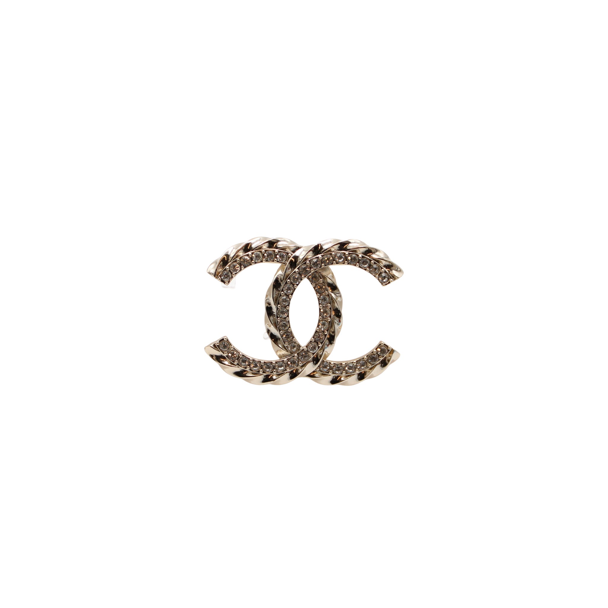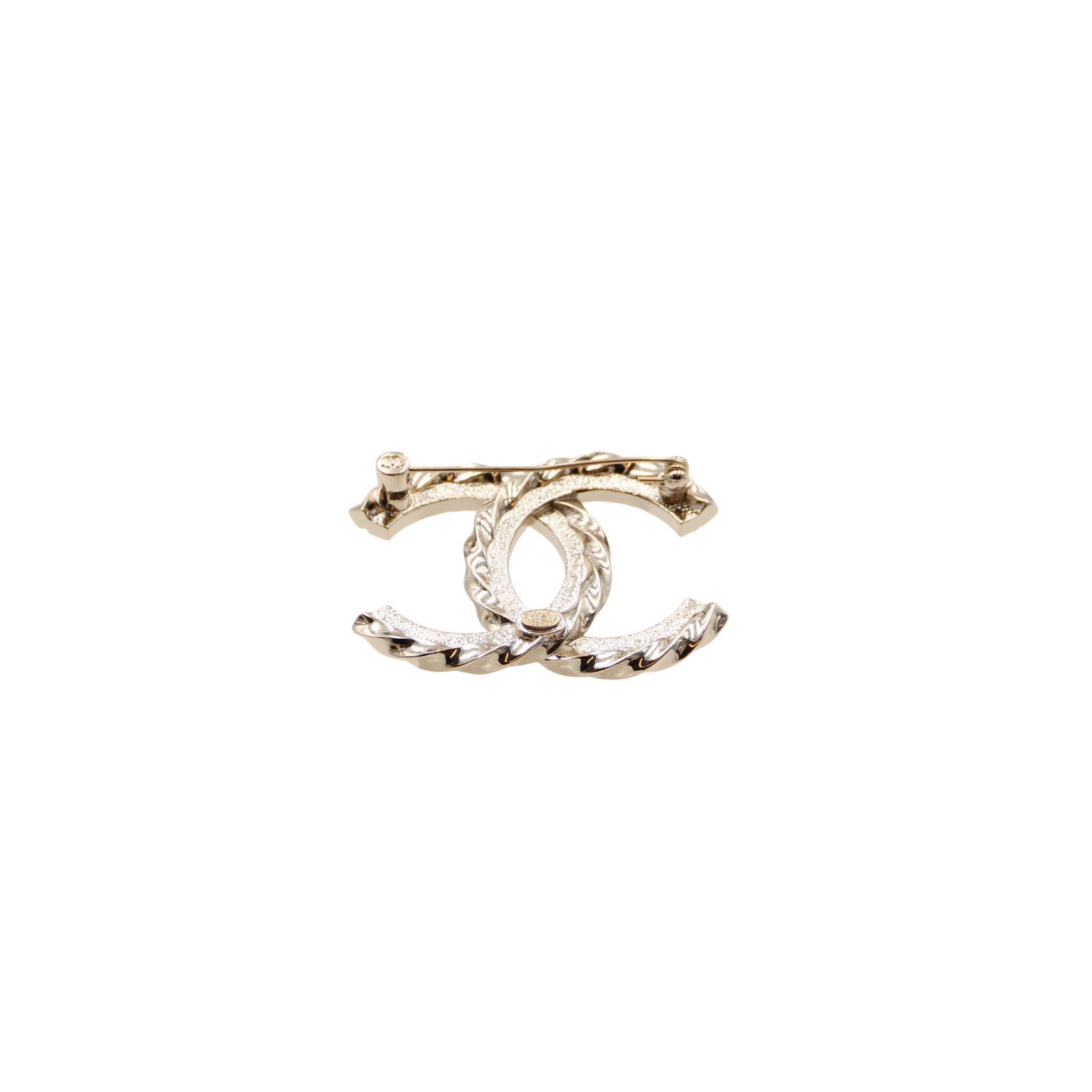 Broche Chanel représentant le double C torsadé, en métal argenté, sublimée de strass étincelants. Une pièce élégante et intemporelle, idéale pour habiller une veste, un pull ou un foulard.