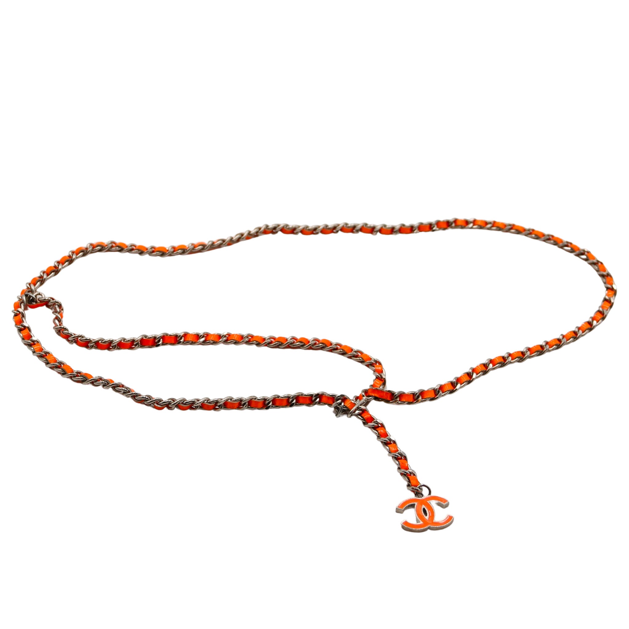CHANEL – Ceinture chaîne cuir entrelacé – Orange / métal argenté
