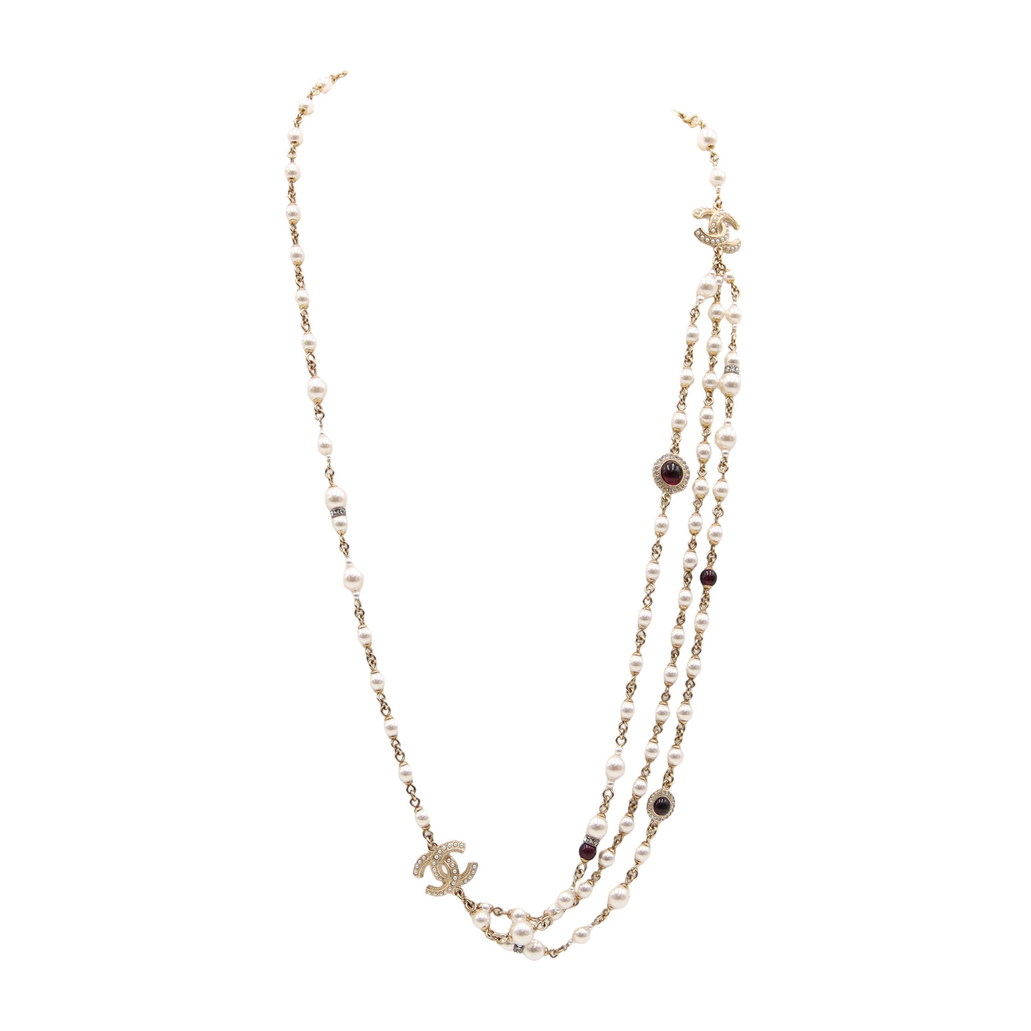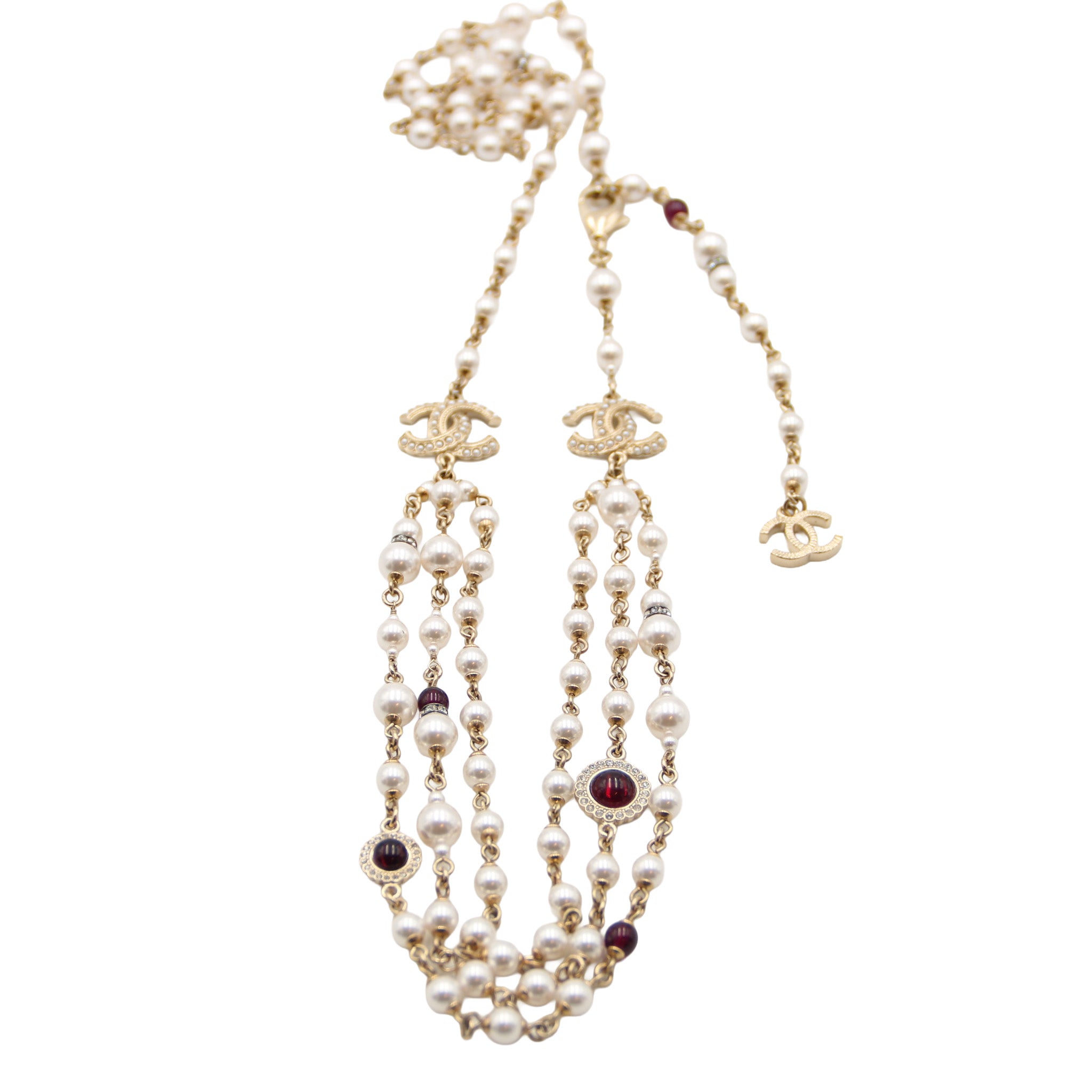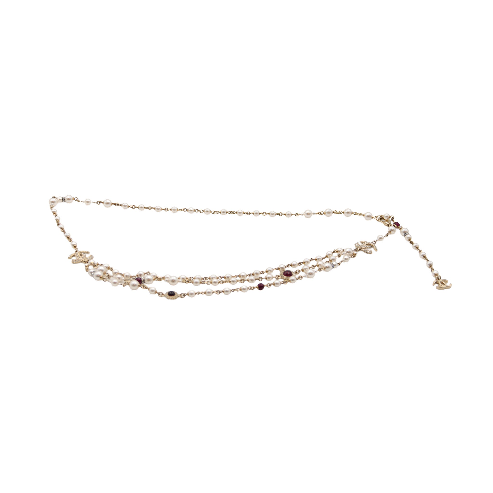 Bijou transformable Chanel de la collection Automne 2020, pouvant se porter aussi bien en ceinture qu’en sautoir. Confectionné en métal doré vieilli, il est orné de perles en résine ivoire, de cabochons bordeaux et de logos CC pavés de strass scintillants. Une pièce polyvalente, élégante et emblématique de la maison Chanel.