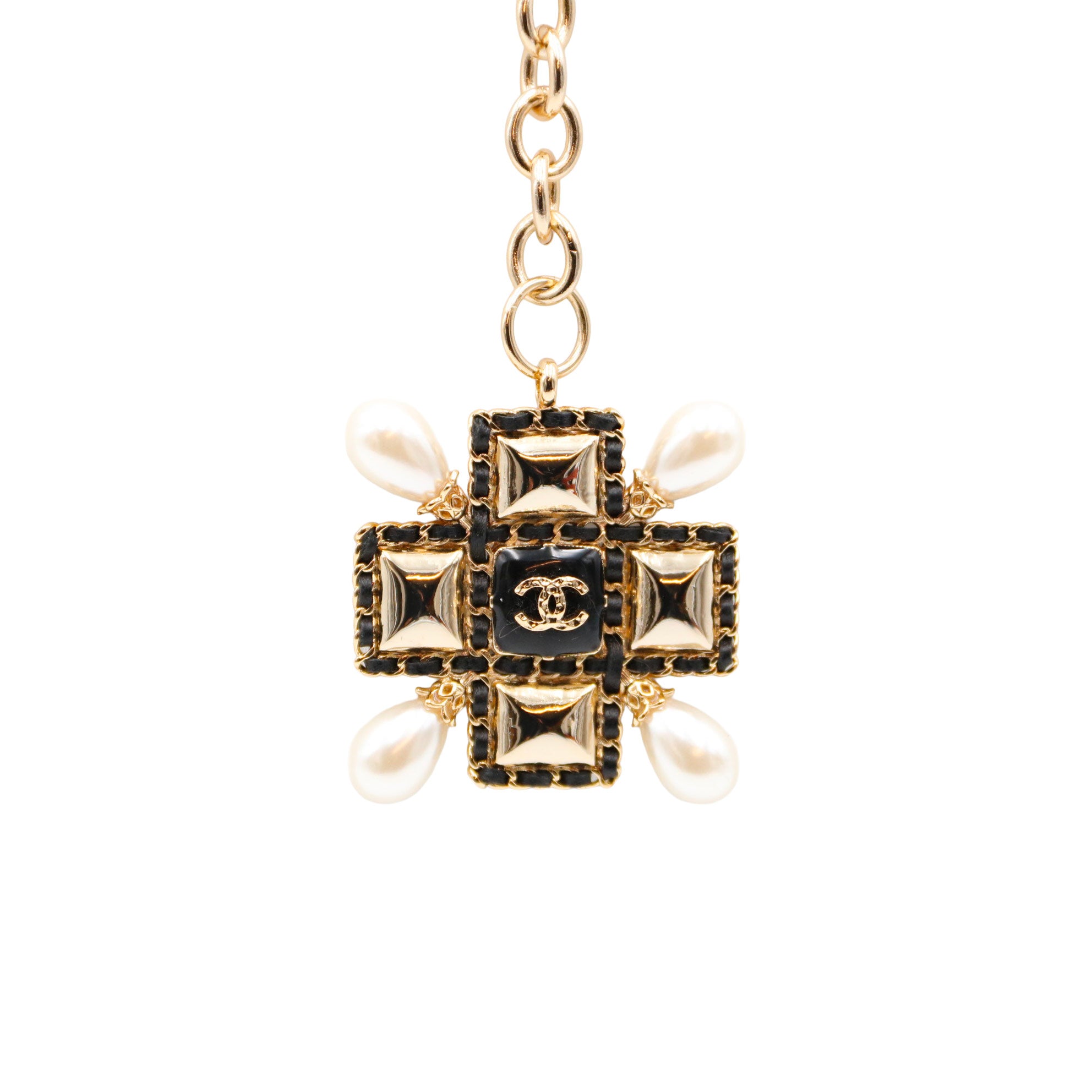 Collier Chanel issu de la collection 2018, composé d’une chaîne en métal doré vieilli et d’un pendentif en forme de croix byzantine. Orné de cabochons noirs sertis de strass et rehaussé de perles baroques en résine ivoire, ce bijou incarne l’élégance historique et intemporelle de la maison Chanel. Le centre de la croix est délicatement signé du logo CC.