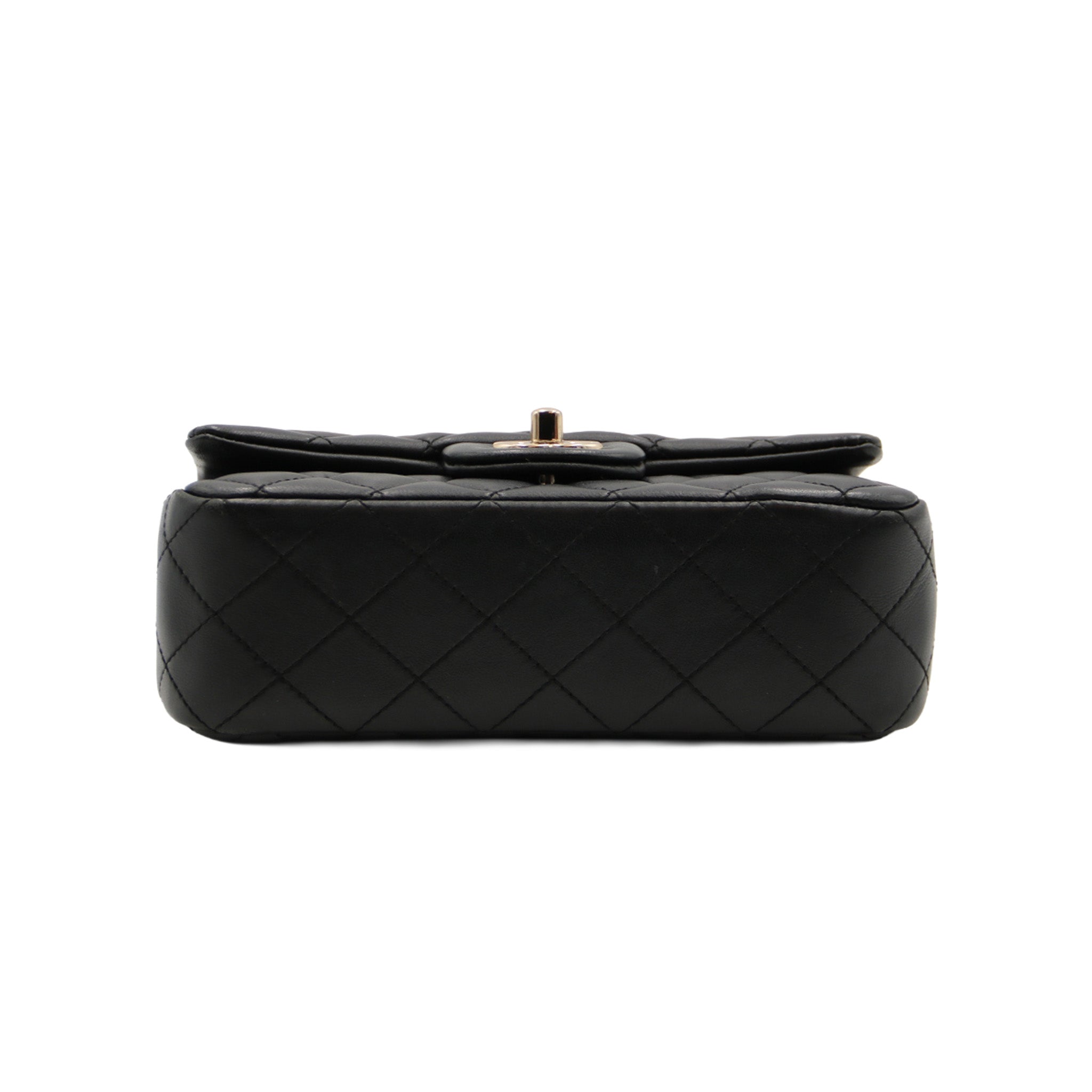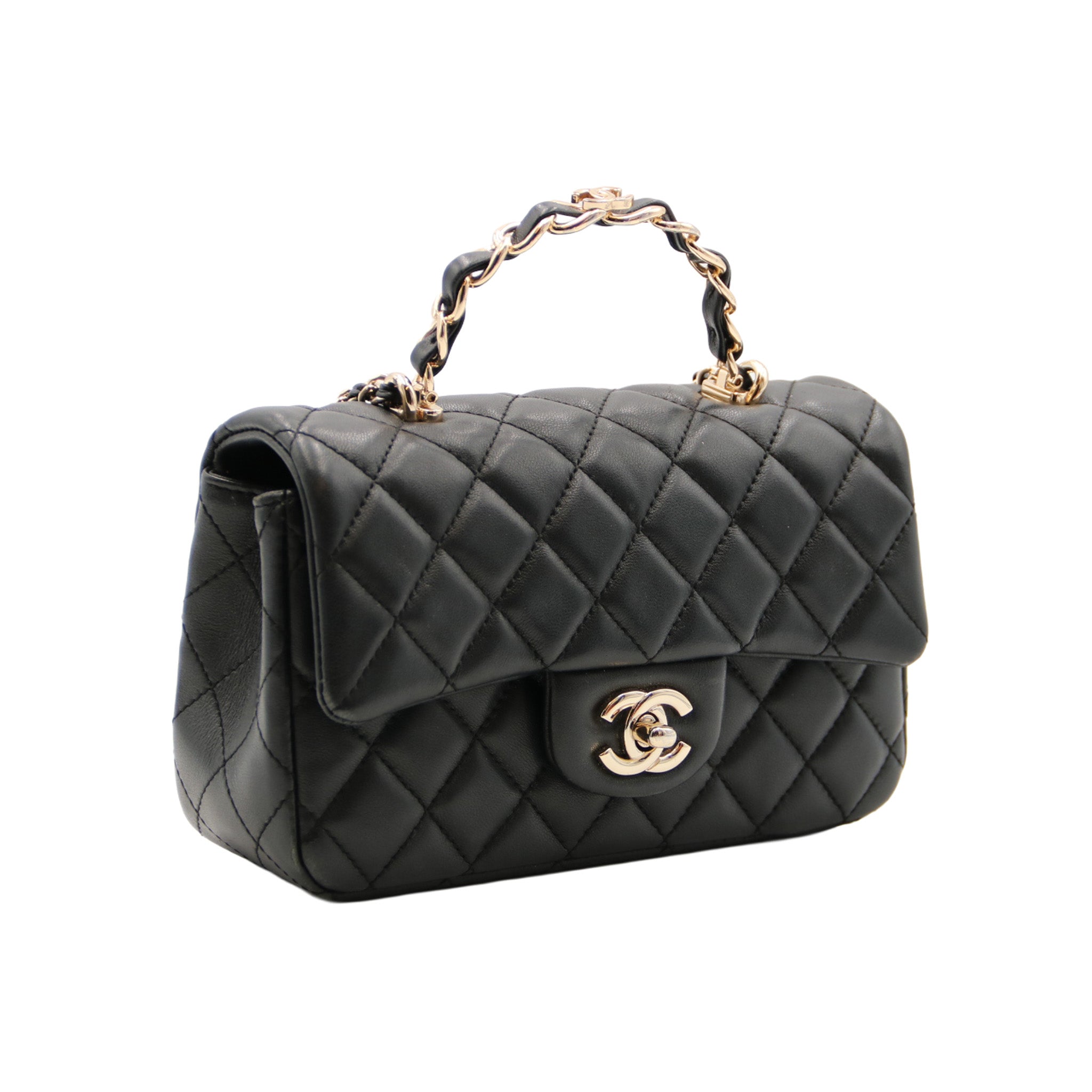 CHANEL – Mini sac classique avec poignée en agneau noir & métal doré
