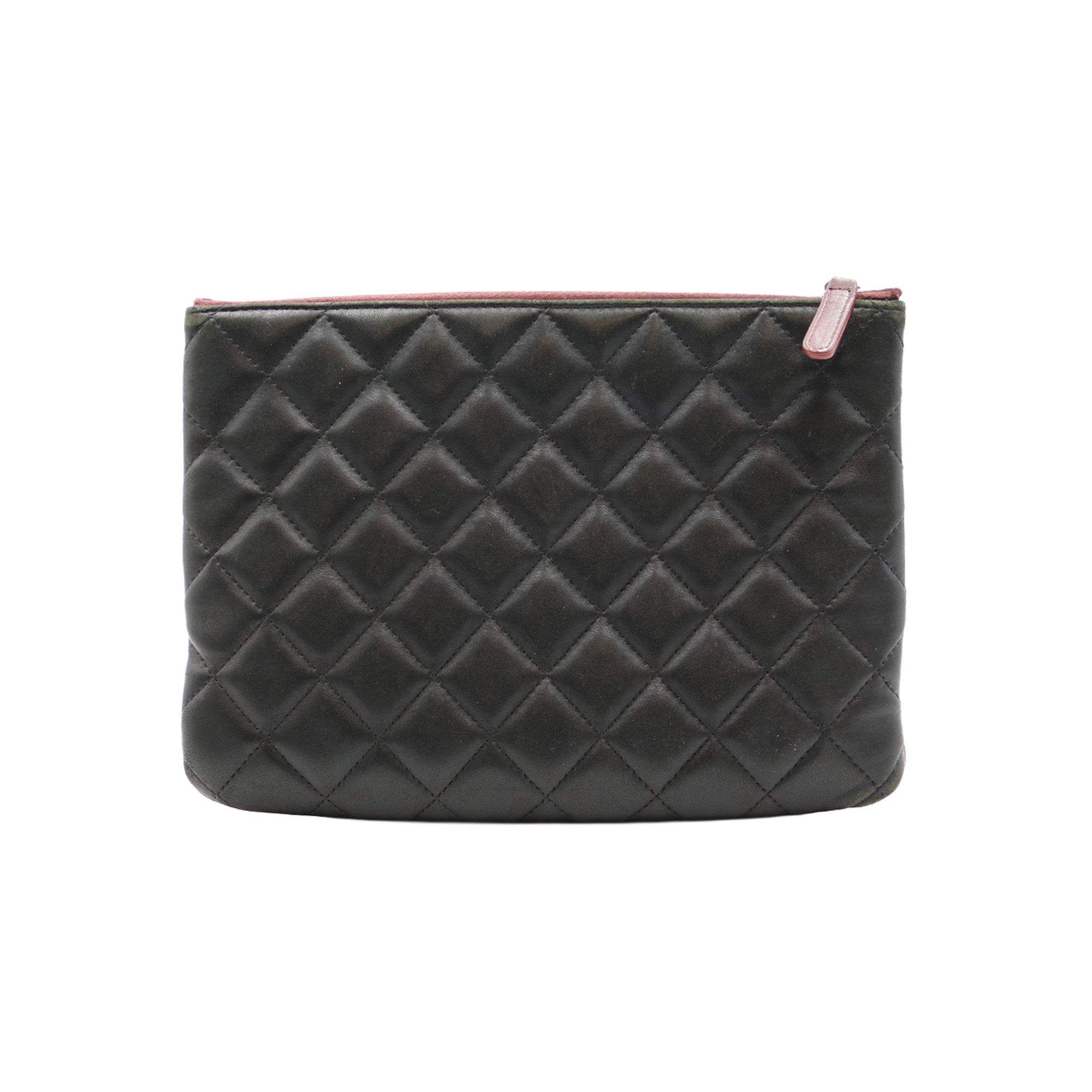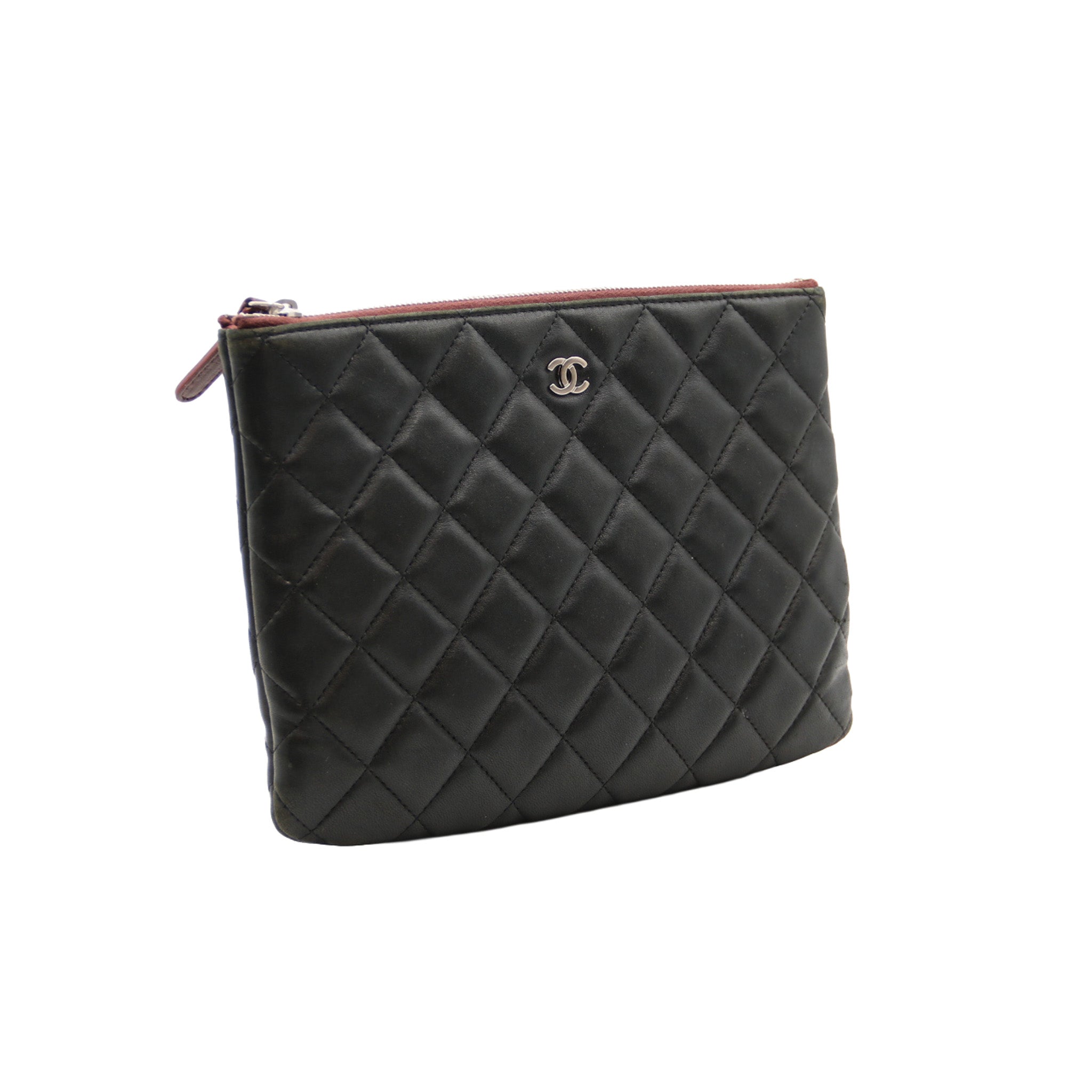 Pochette Chanel en cuir d’agneau noir matelassé, bijouterie dorée.