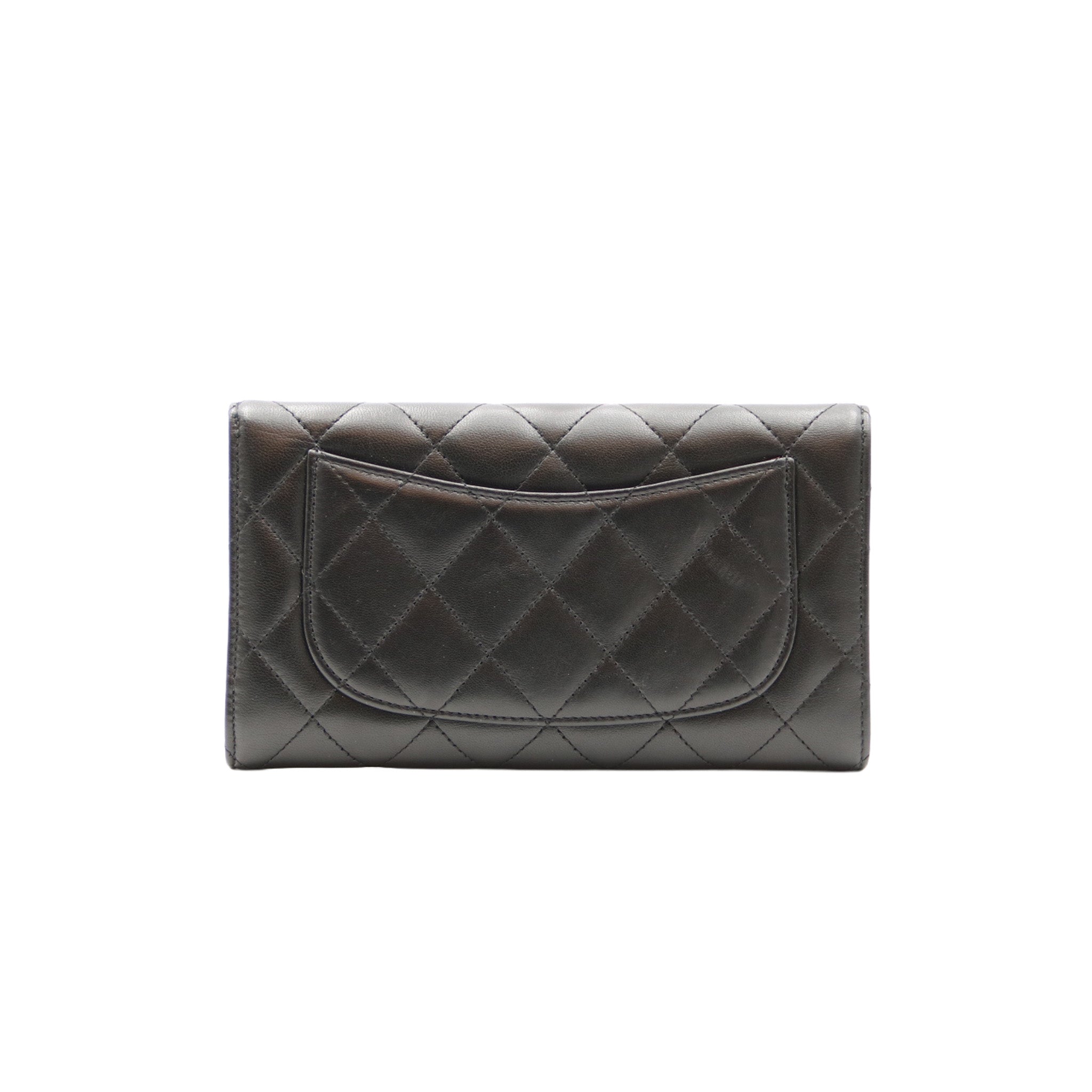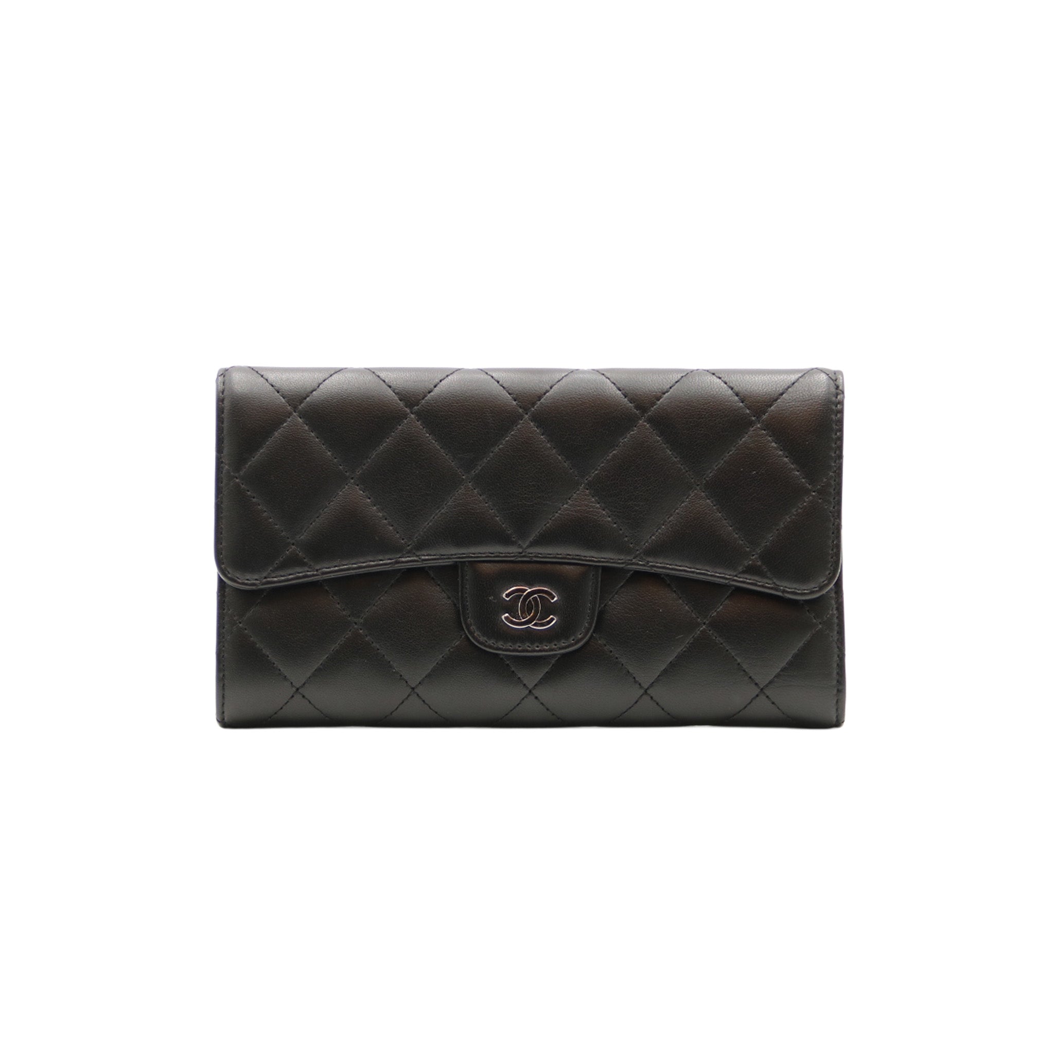 Portefeuille Chanel Timeless en cuir noir matelassé, bijouterie argentée.