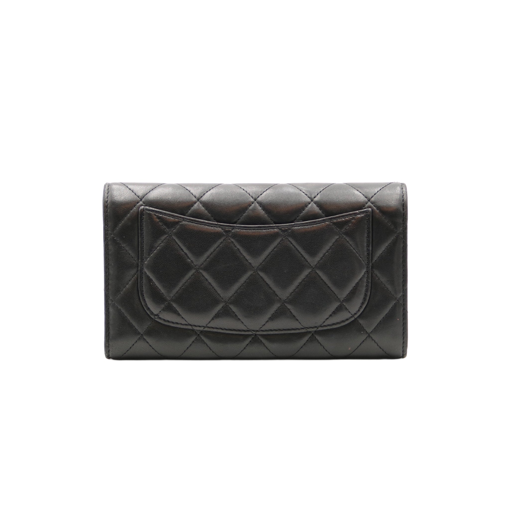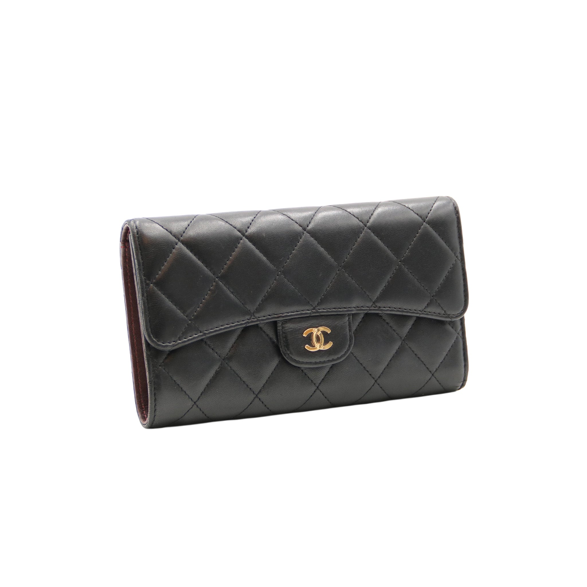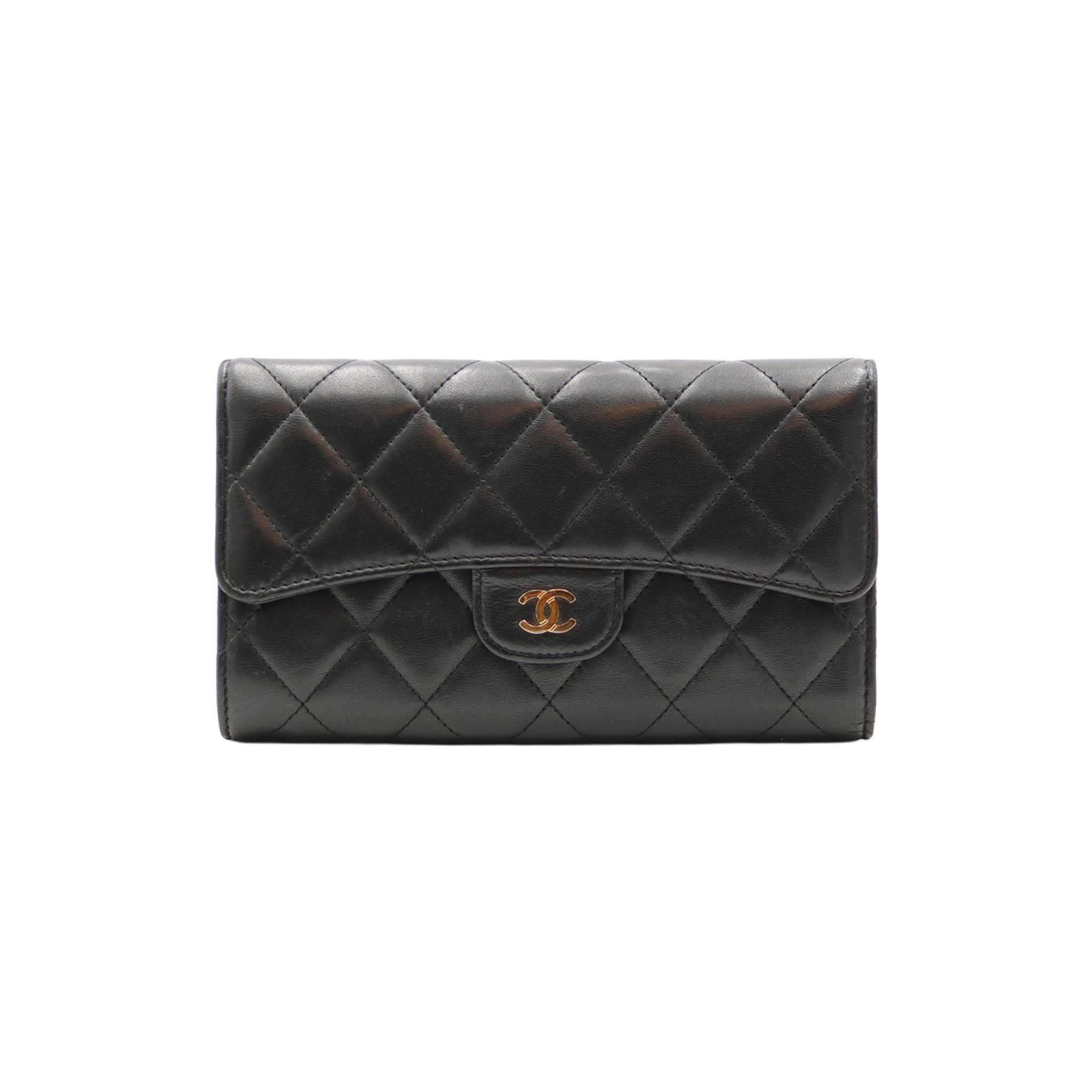 Portefeuille Chanel Timeless vintage en cuir noir matelassé, bijouterie dorée.