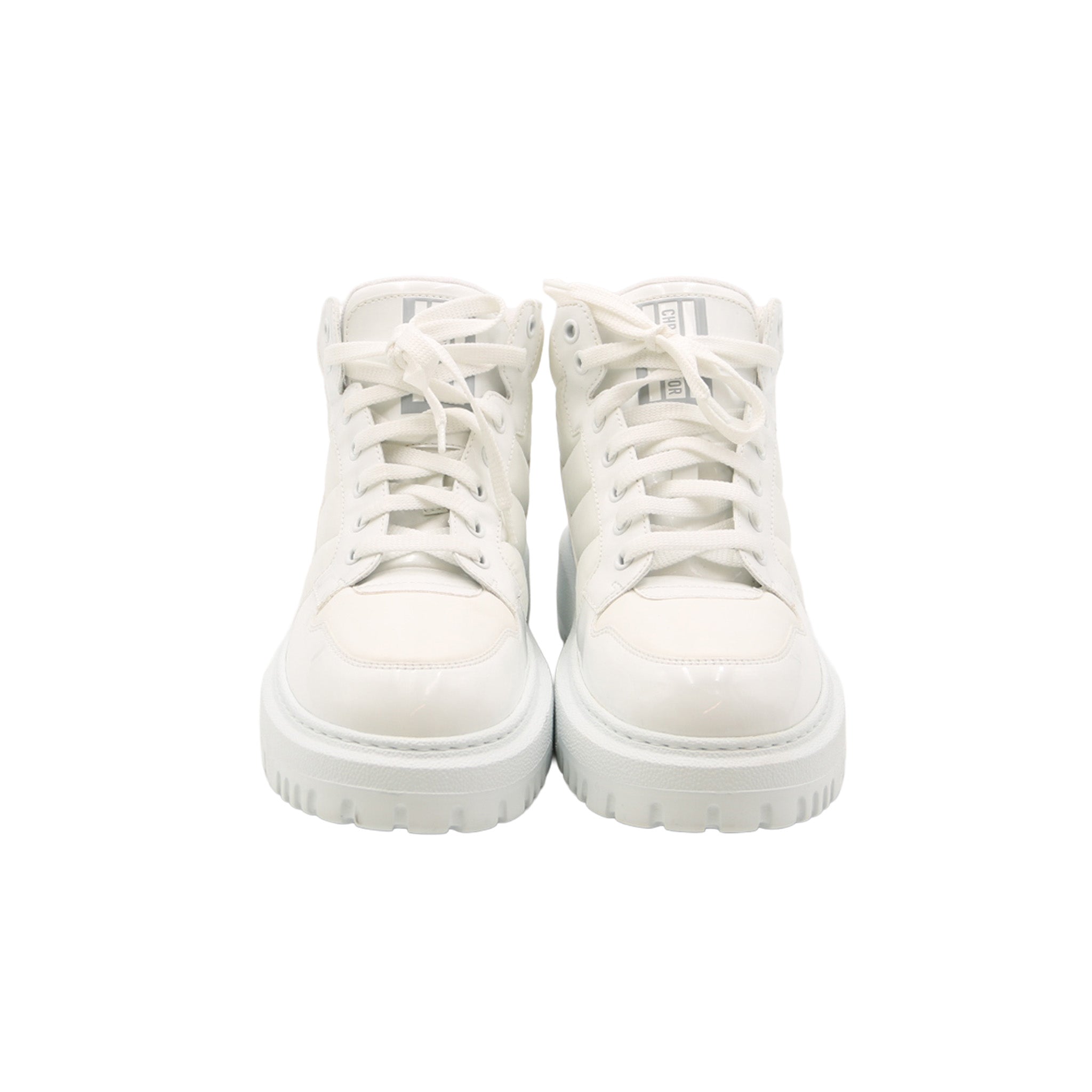 Bottines montantes Dior au design contemporain, réalisées en cuir lisse blanc avec signature DIOR contrastée sur le côté. Ce modèle emblématique associe une silhouette urbaine à une semelle épaisse crantée pour un look à la fois moderne et confortable. Parfaites pour un style casual chic ou streetwear luxe.
