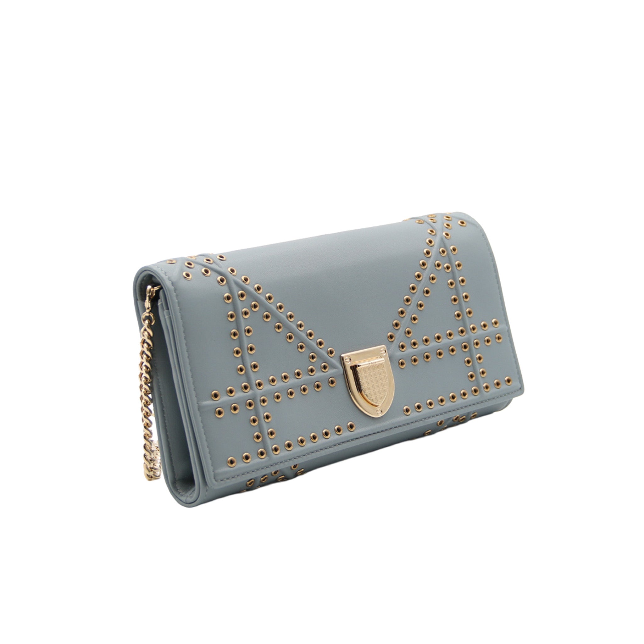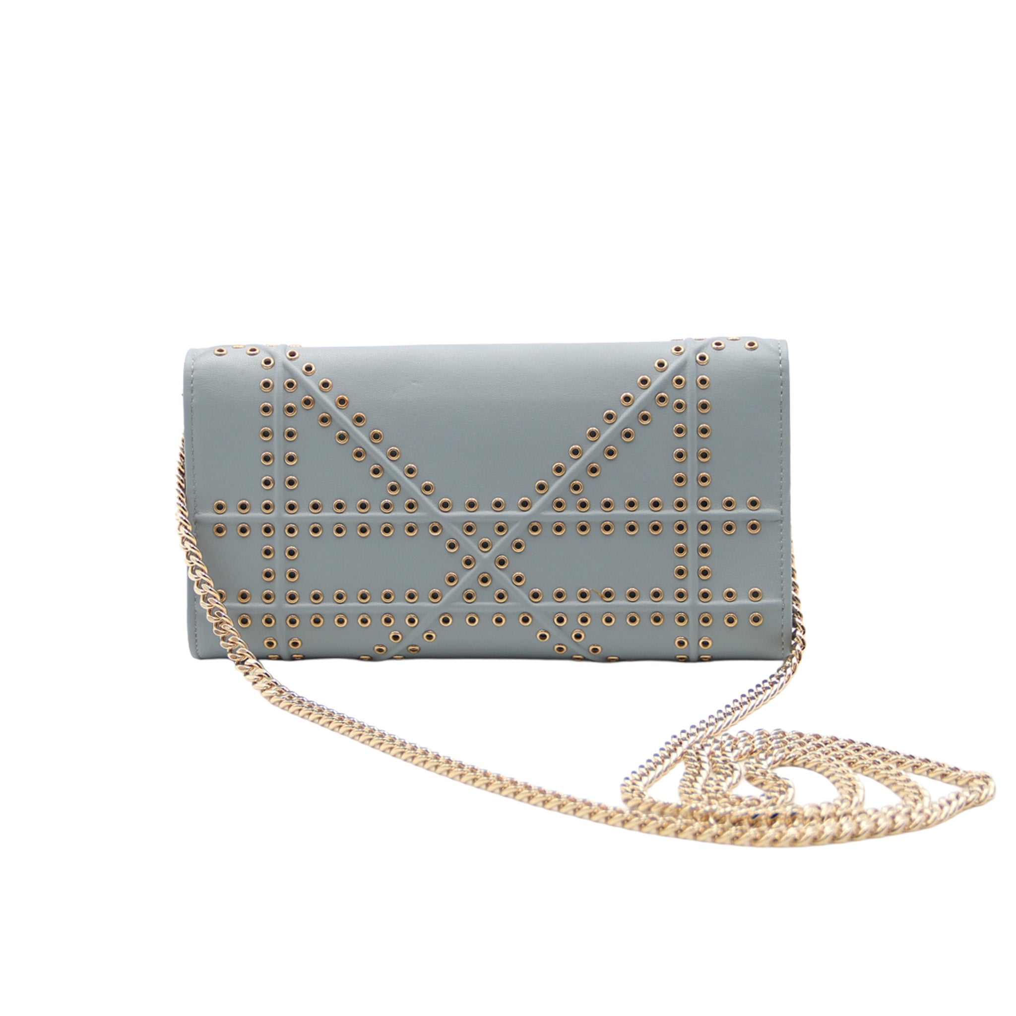 Pochette Dior Diorama en cuir gris perle, sublimée d’un motif graphique signé de multiples œillets dorés. Modèle structuré et élégant, à porter à la main ou en bandoulière grâce à sa chaîne amovible.