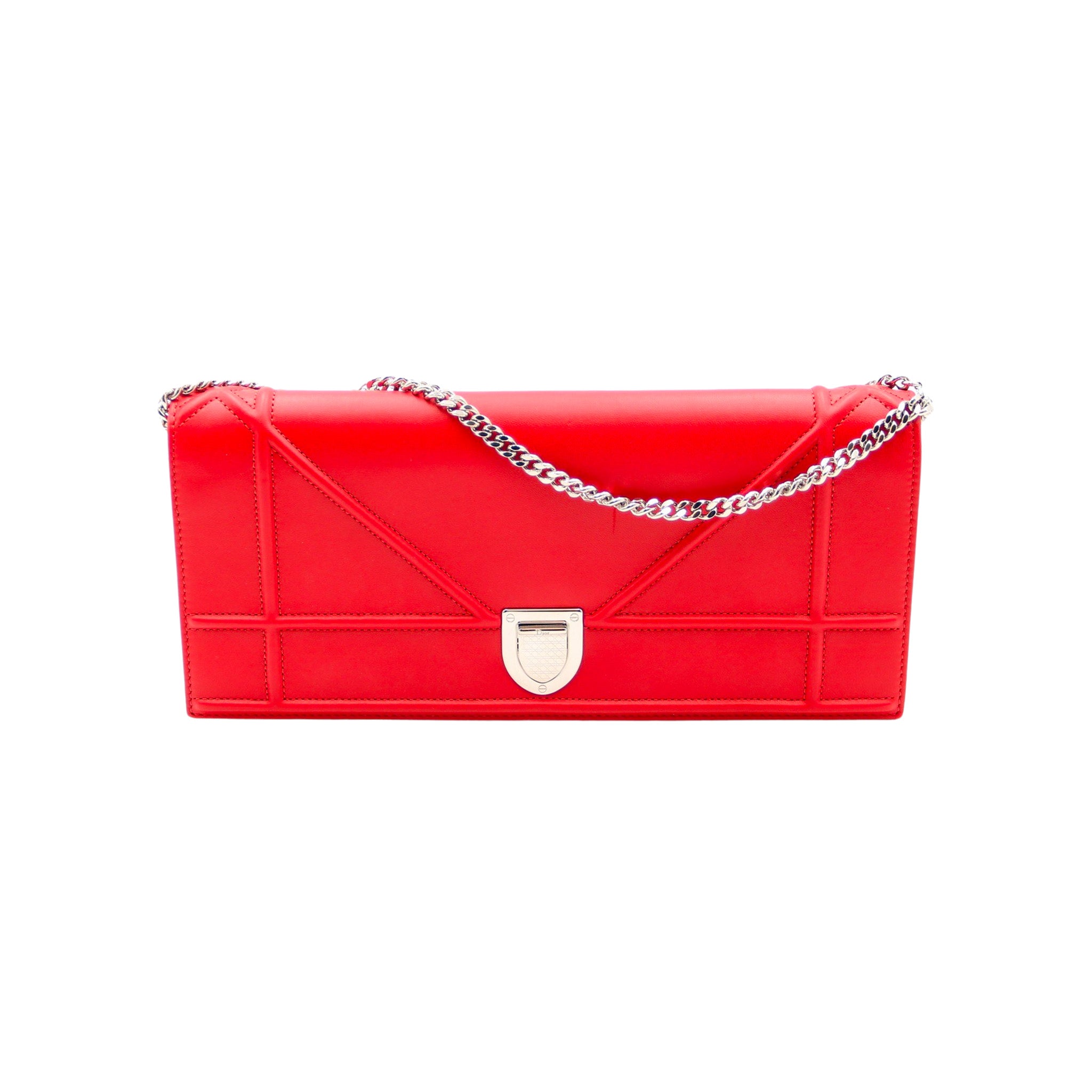Élégante et contemporaine, la Diorama Wallet on Chain GM incarne l’esthétique graphique de la maison Dior. Réalisée en cuir de veau lisse rouge, elle se distingue par son motif architectural embossé et son fermoir écusson argenté. Sa chaîne métallique lui permet un porté épaule ou croisé, faisant de ce modèle un accessoire de soirée chic et audacieux.