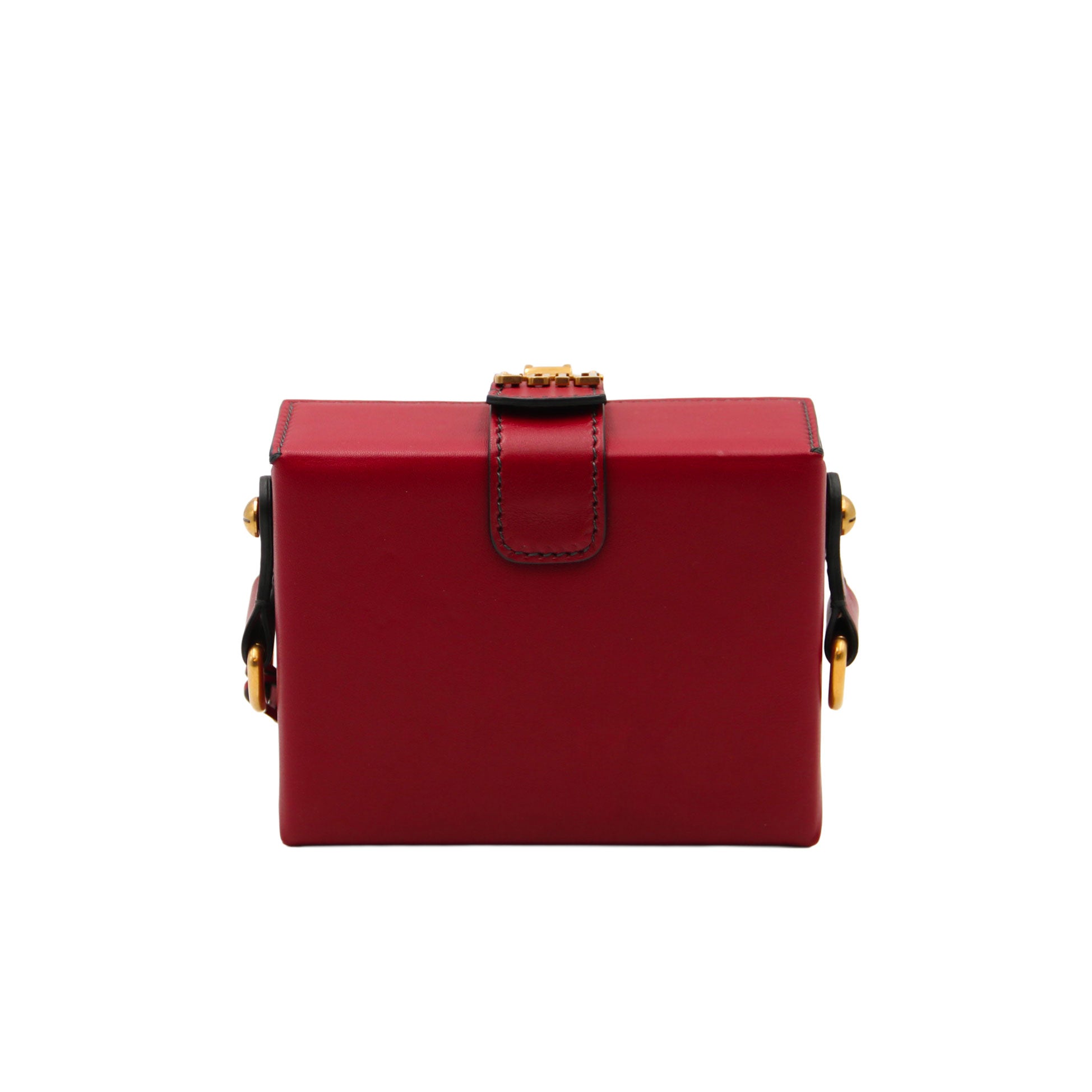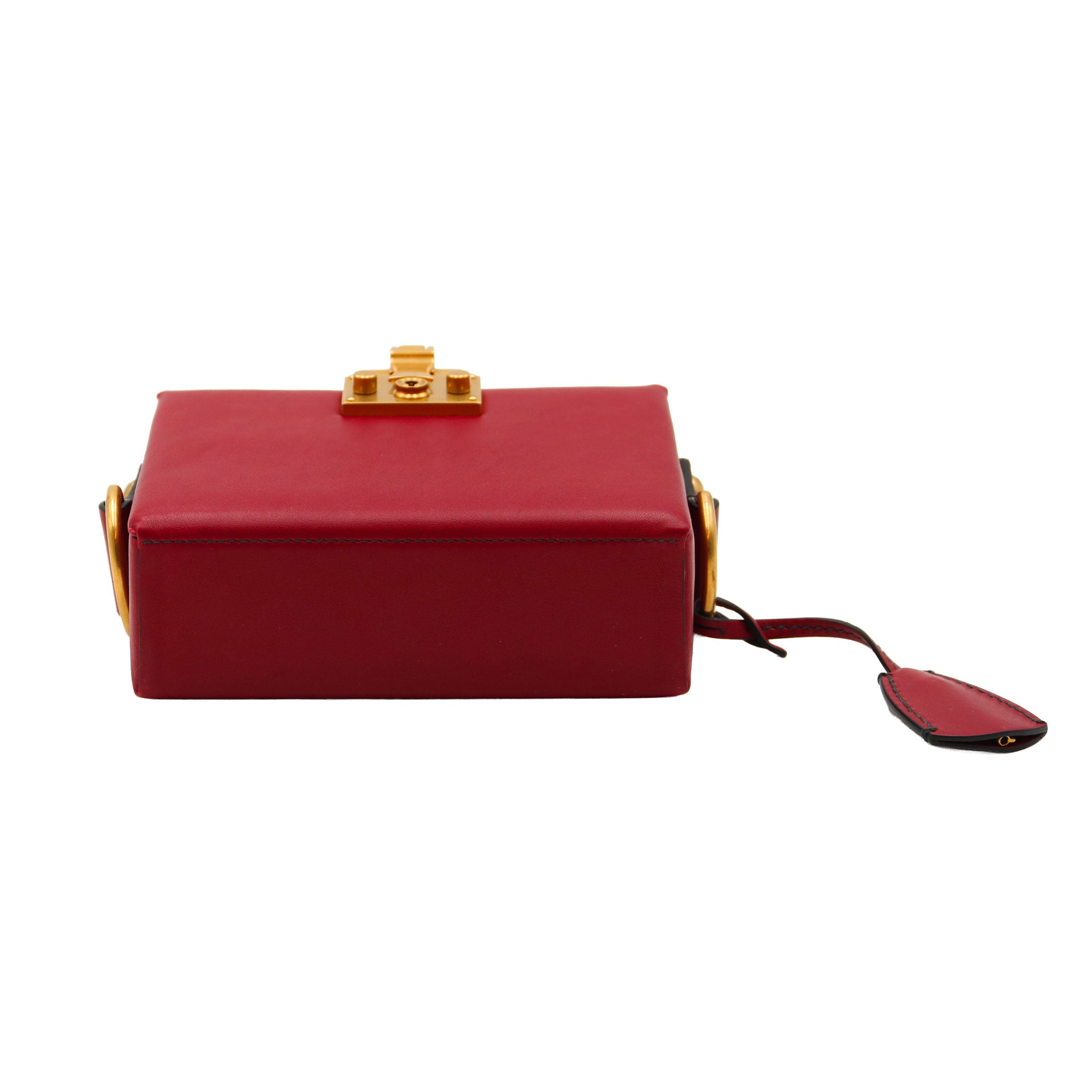 Sac rigide en cuir lisse bordeaux signé Dior, inspiré des malles anciennes. Son fermoir coffret en métal doré gravé "DIOR" lui confère un style sophistiqué et unique. Un modèle rare et recherché, idéal en sac de soirée ou pour apporter une touche couture à vos looks.