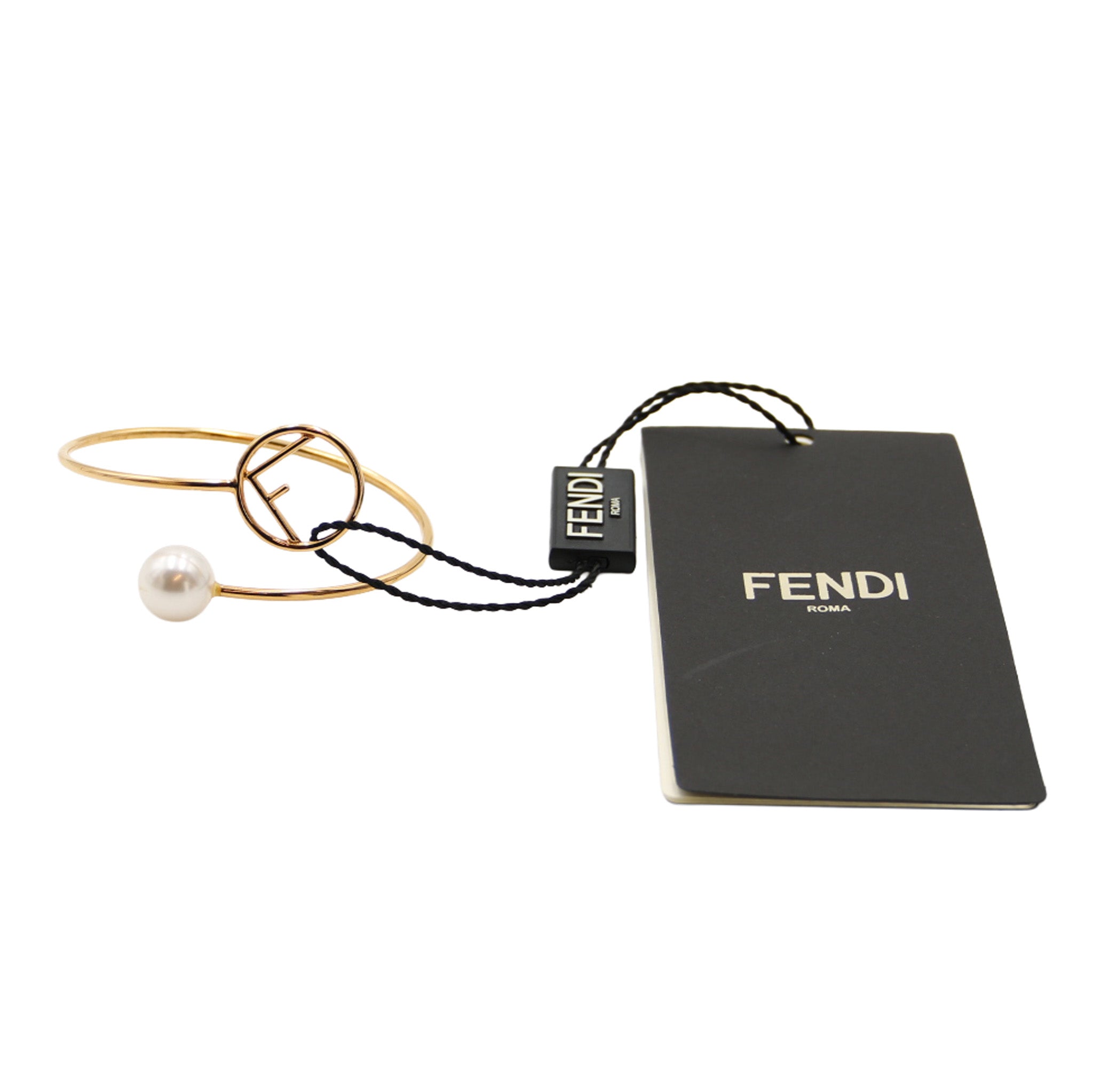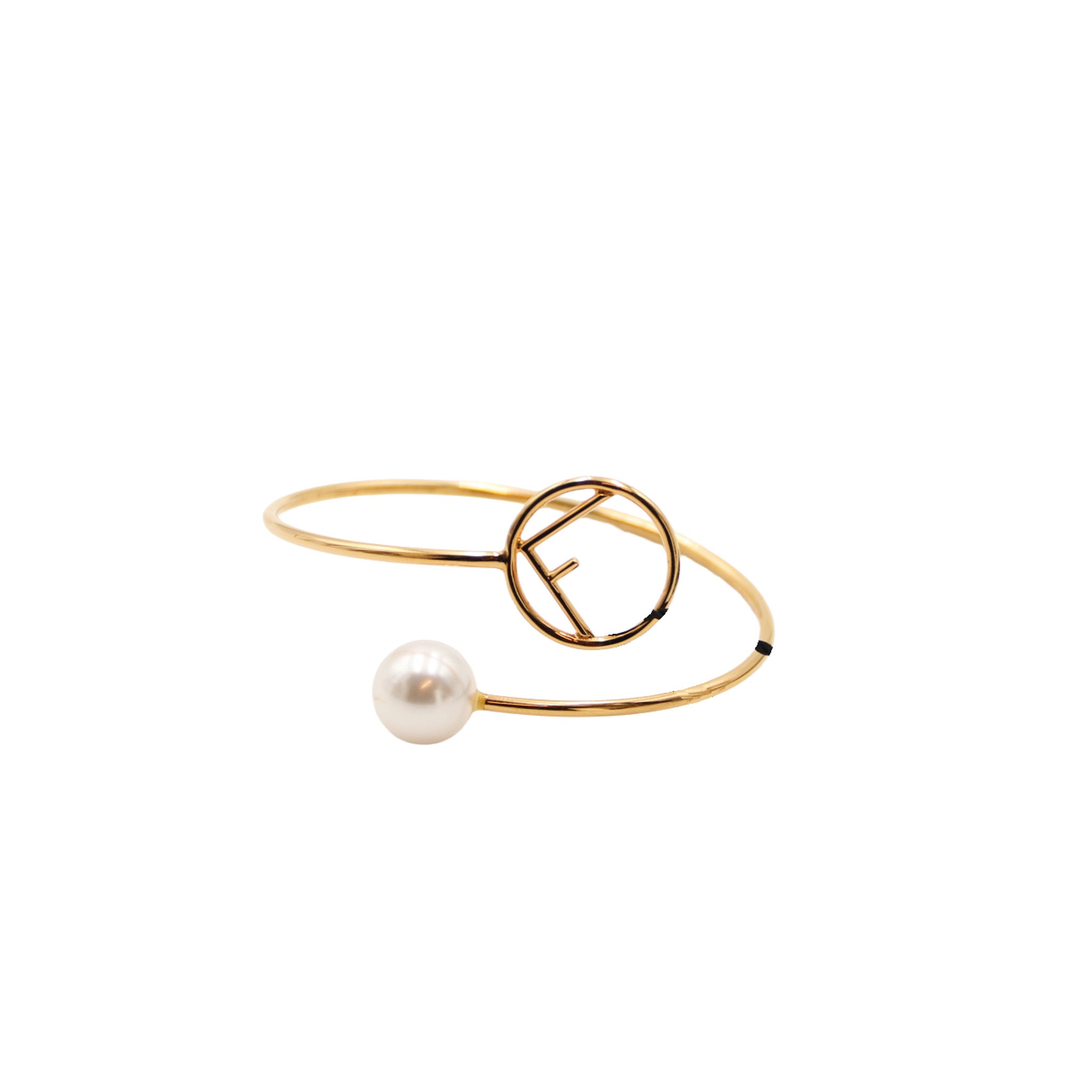 Bracelet Fendi en métal doré orné d'une perle blanche et du logo F circulaire iconique.