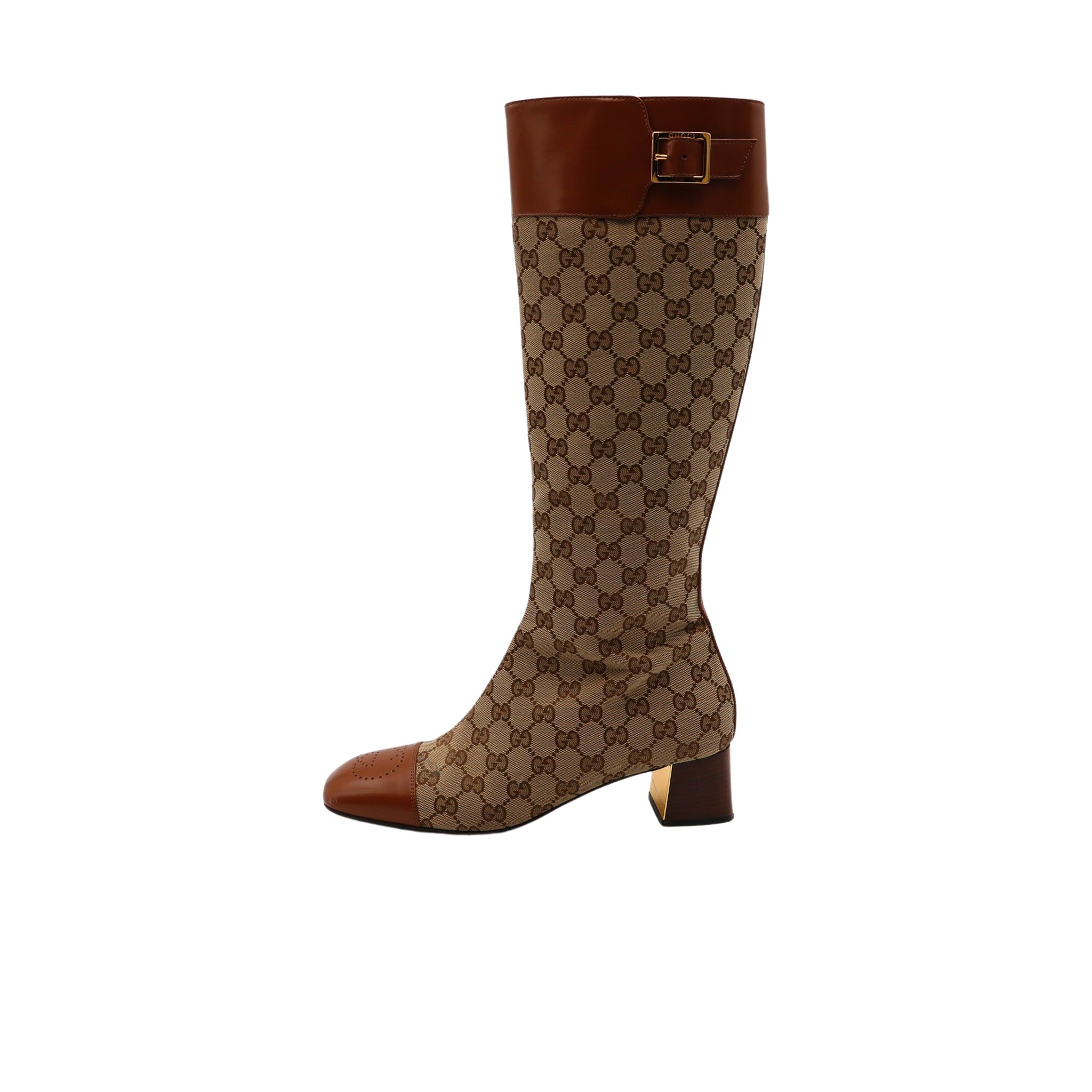 Ces bottes Gucci à l’allure rétro revisitent les codes emblématiques de la maison italienne. Réalisées en toile monogram GG beige et cuir lisse camel, elles allient élégance classique et esprit seventies. Le bout perforé, la bride haute à boucle dorée et le talon carré à hauteur modérée offrent un équilibre parfait entre confort et sophistication.