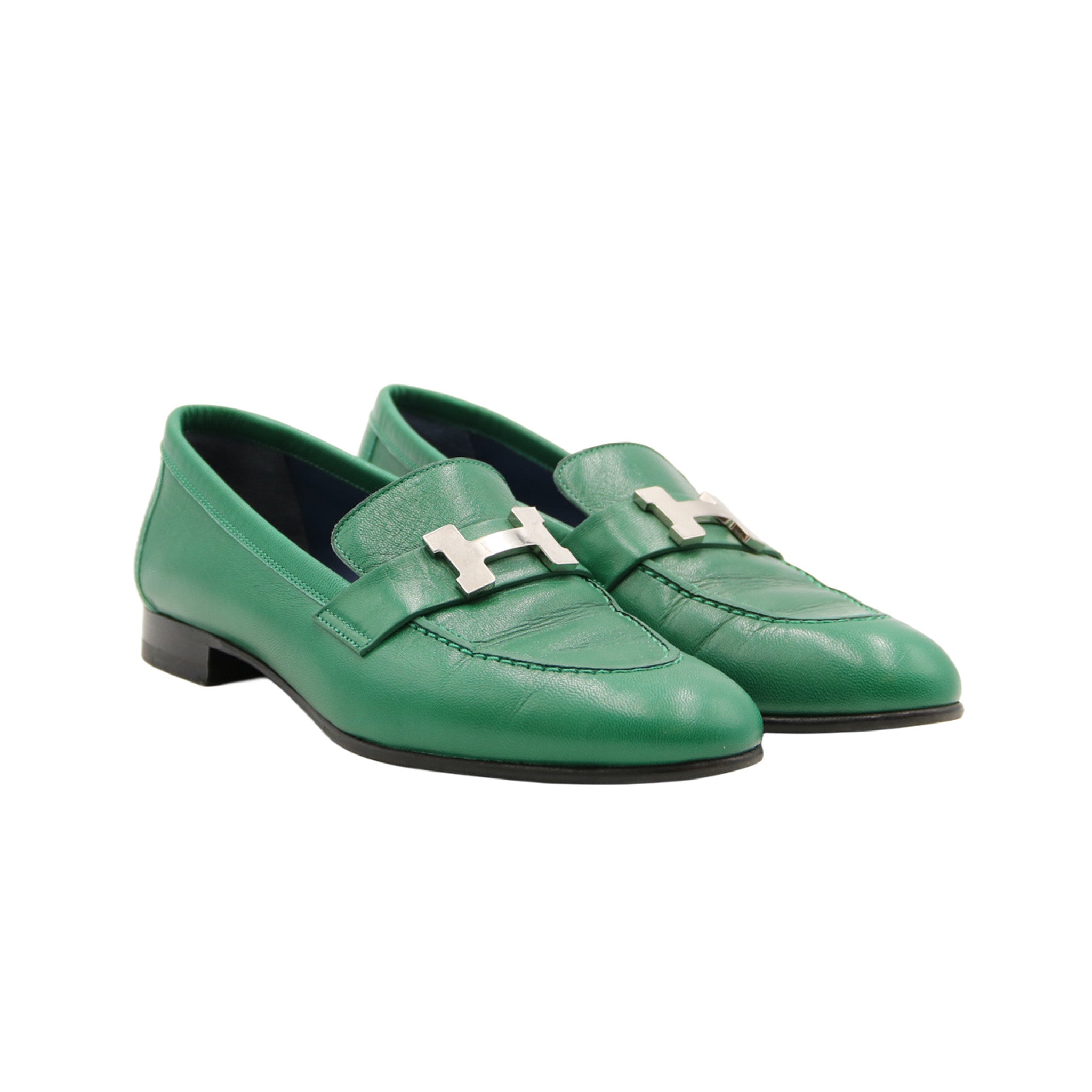 Ces mocassins Hermès incarnent l’élégance intemporelle et le savoir-faire artisanal de la maison. Confectionnés en cuir lisse vert, ils sont sublimés par le célèbre mors en métal argenté à l’avant, signature iconique de la marque. Leur silhouette épurée et leur petit talon assurent un confort optimal tout en conservant une allure chic et raffinée, parfaite au quotidien comme pour des tenues plus habillées.