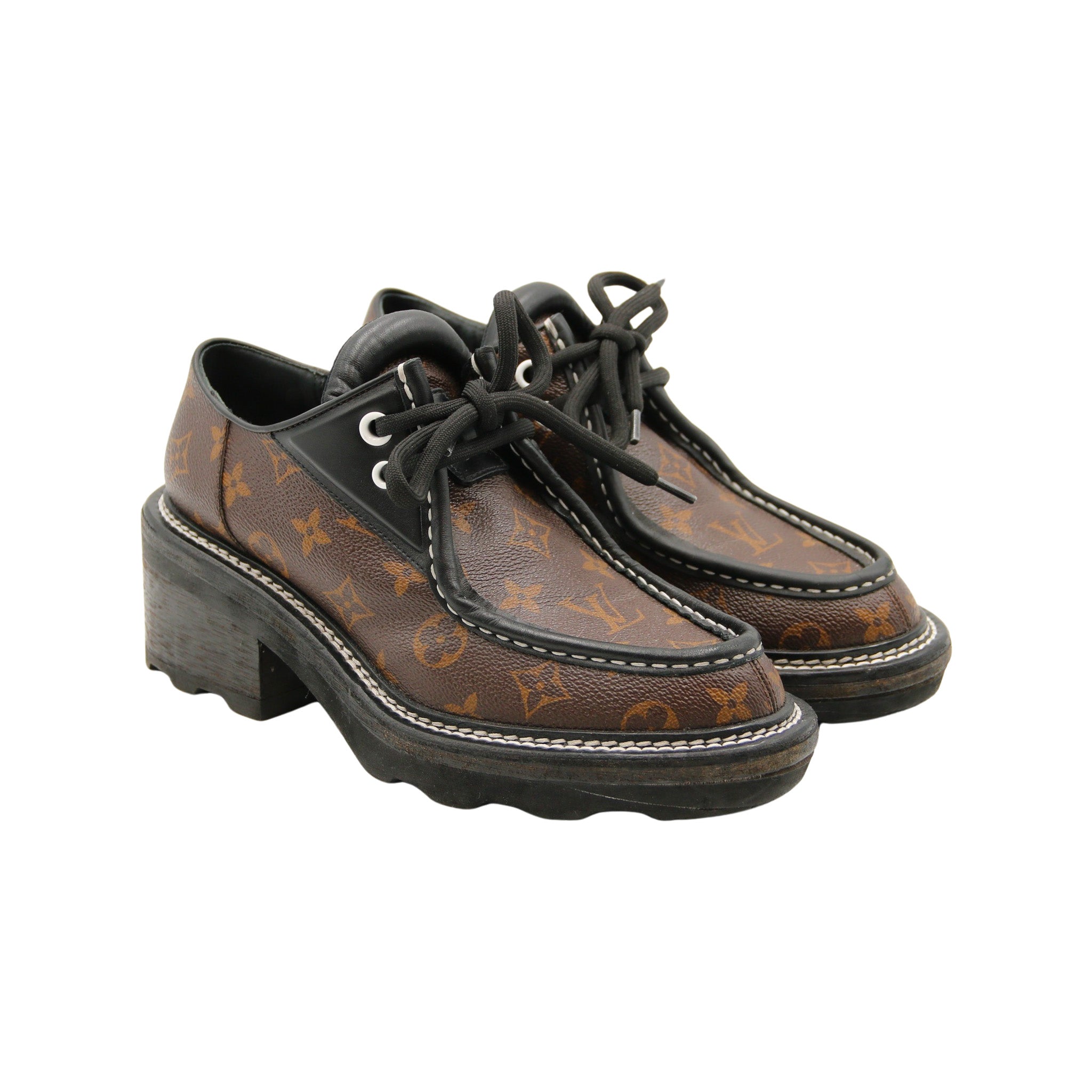 Ce modèle de derbys Louis Vuitton s’impose par son esthétique audacieuse : des panneaux en toile monogram classique sont associés à des empiècements en cuir noir, soulignés par un laçage traditionnel. Le contraste de matières apporte modernité et caractère à une silhouette résolument masculine. Avec leur semelle épaisse à crampons, elles conjuguent présence urbaine et confort affirmé.