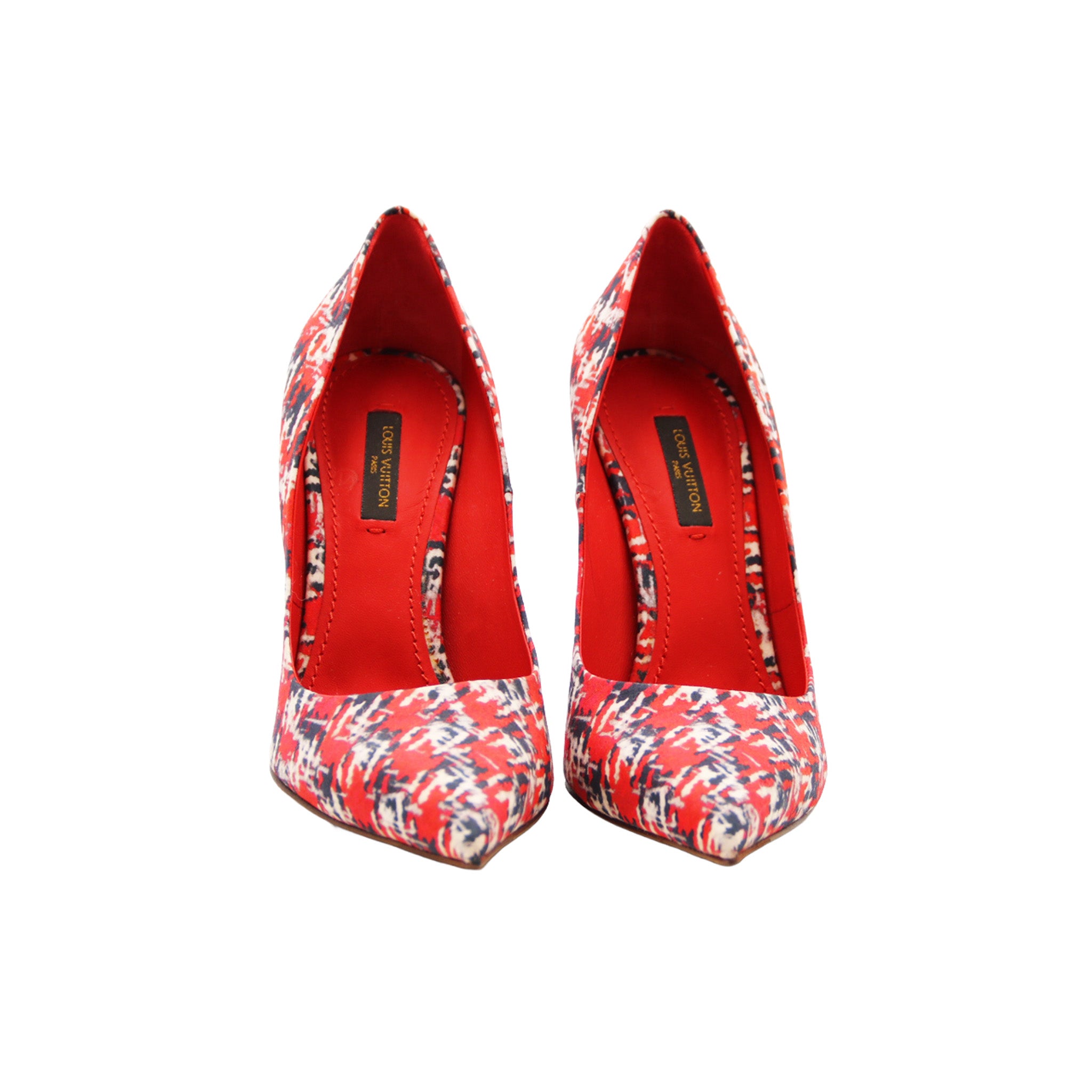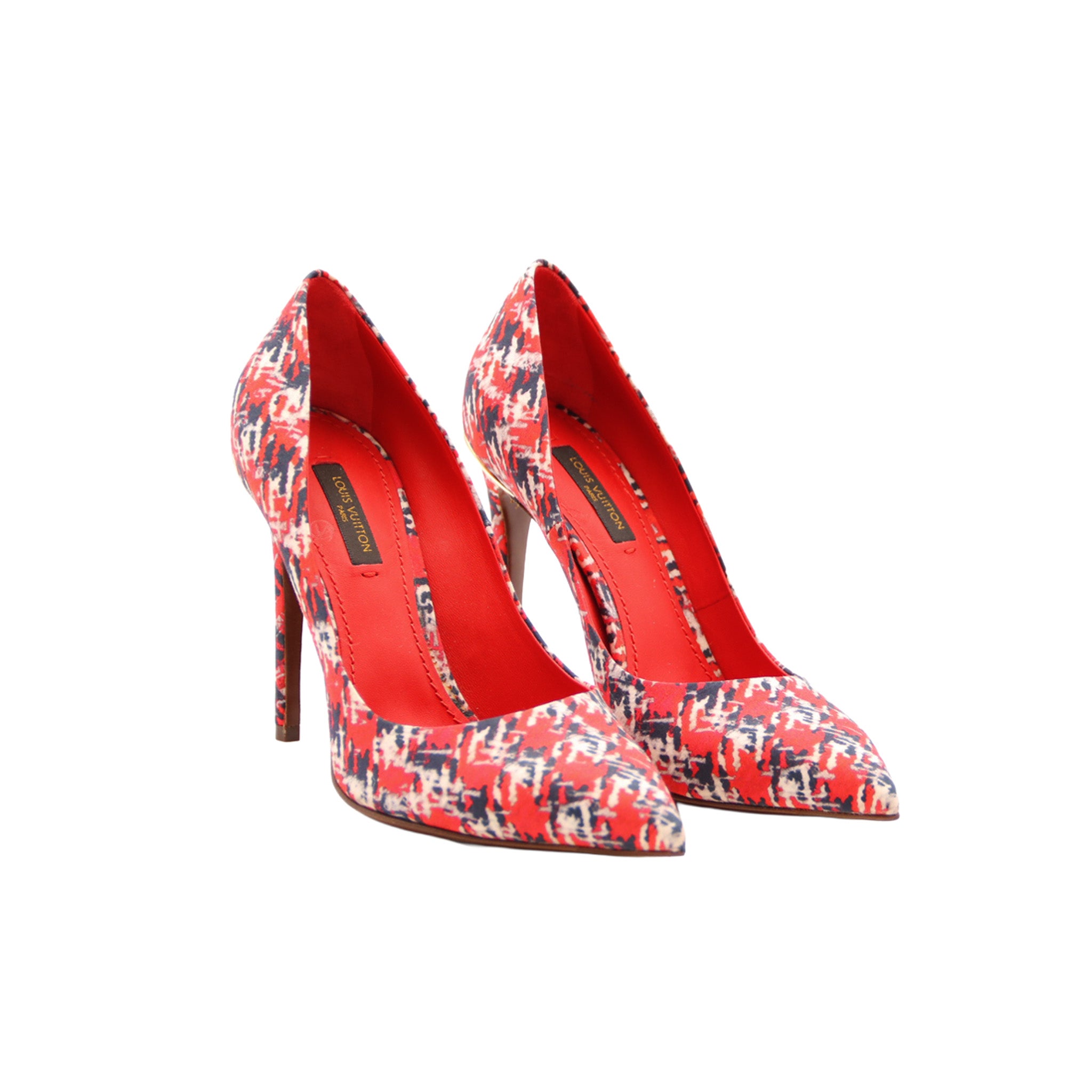 Ces escarpins LOUIS VUITTON séduisent par leur imprimé graphique multicolore aux tonalités rouges, bleues et écrues, apportant une touche artistique et audacieuse à une silhouette élégante. Leur ligne élancée, soulignée par un bout pointu et un talon fin, met en valeur la jambe avec raffinement. L’intérieur rouge signature renforce le contraste et l’identité luxueuse du modèle. Une paire forte, idéale pour sublimer une tenue sophistiquée.