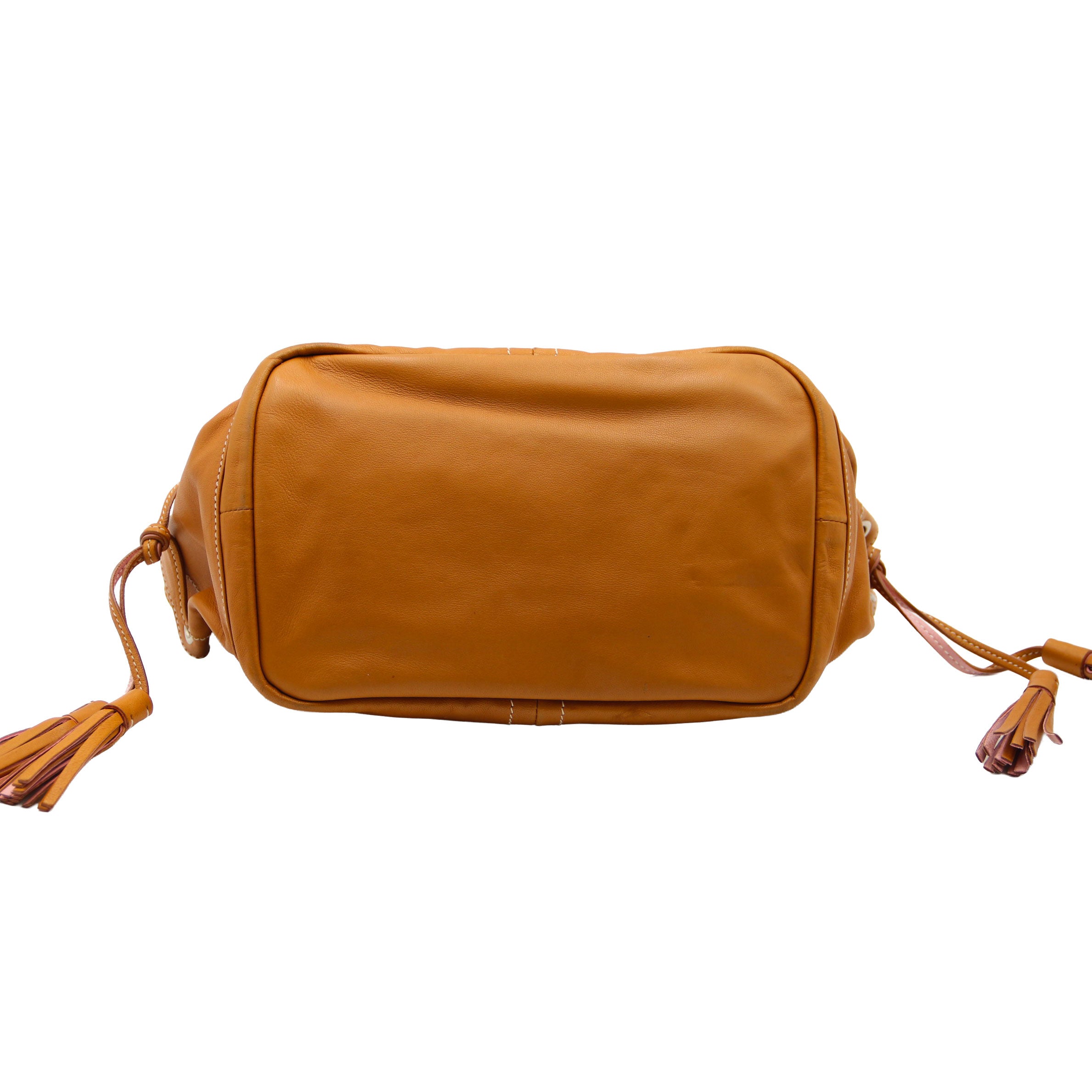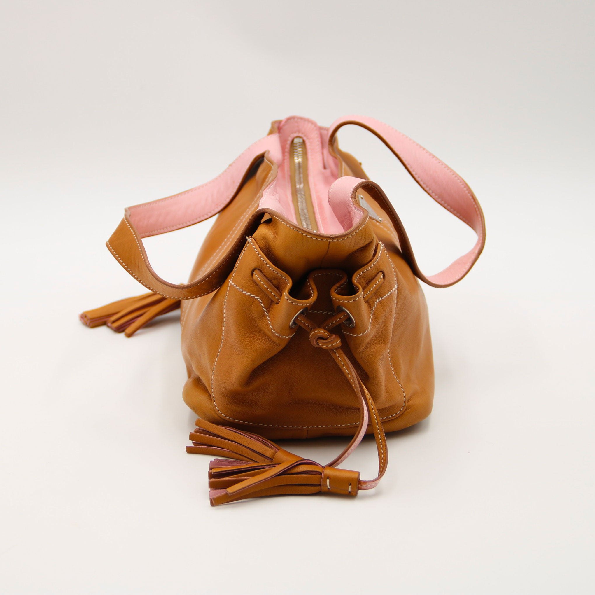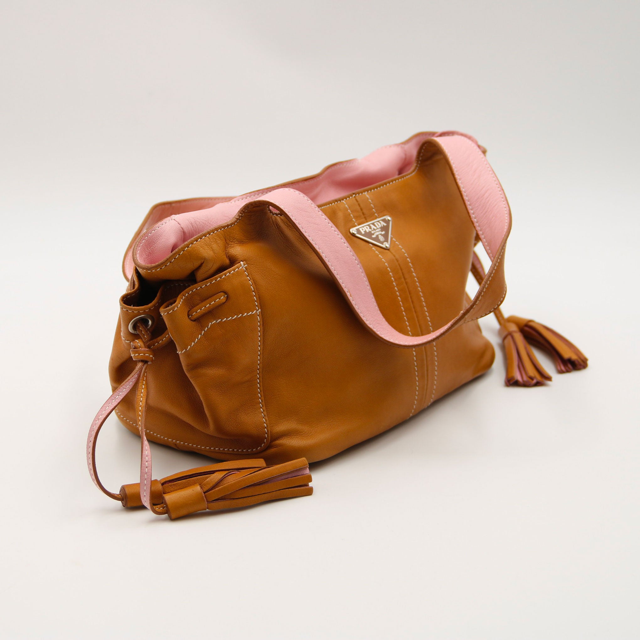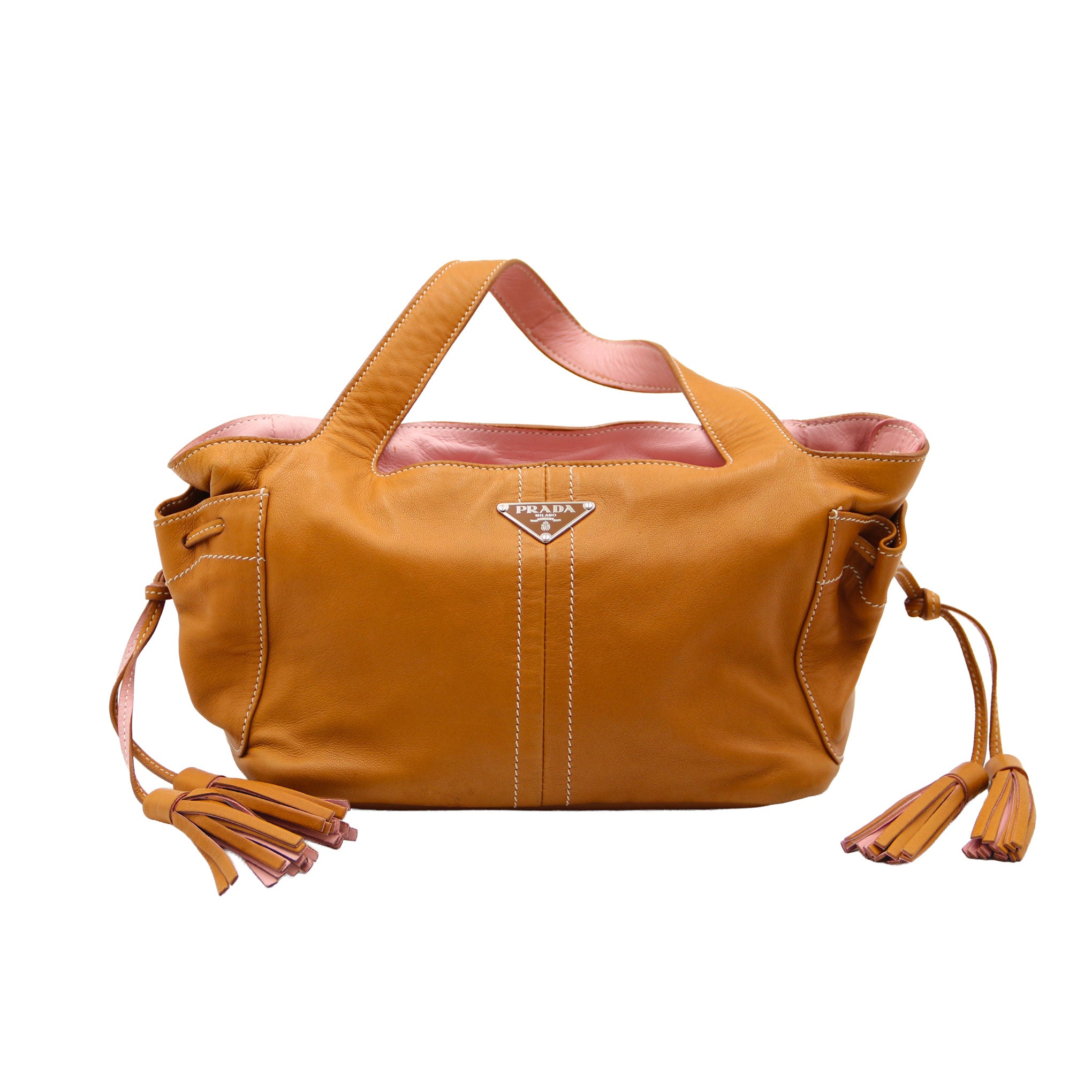 PRADA Sac à main en cuir camel et doublure rose