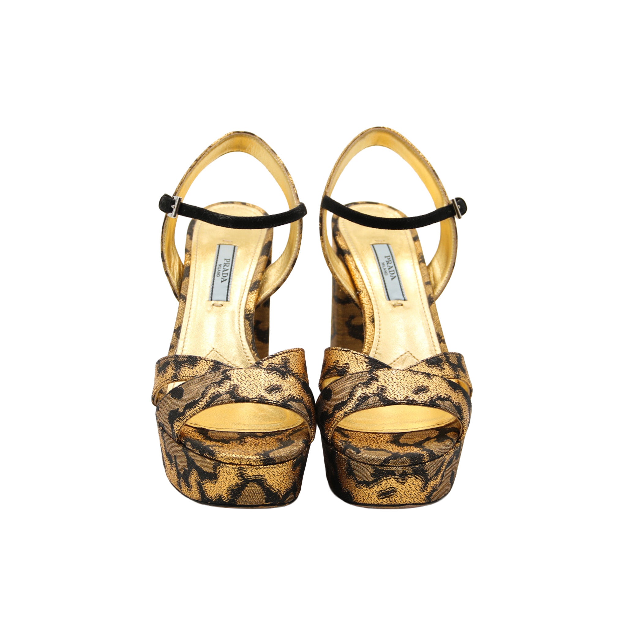 Sandales Prada à plateforme et talon haut en cuir doré et noir, avec bride cheville réglable. Modèle iconique de la Maison Prada, conjuguant élégance et allure rétro-chic pour un style structuré et sophistiqué.