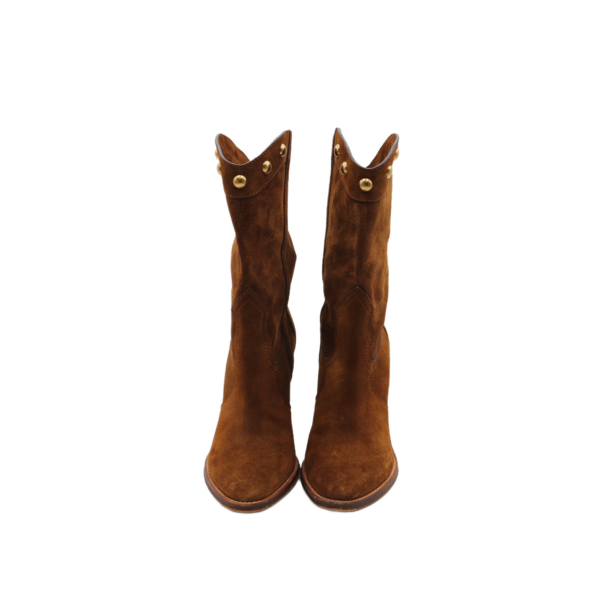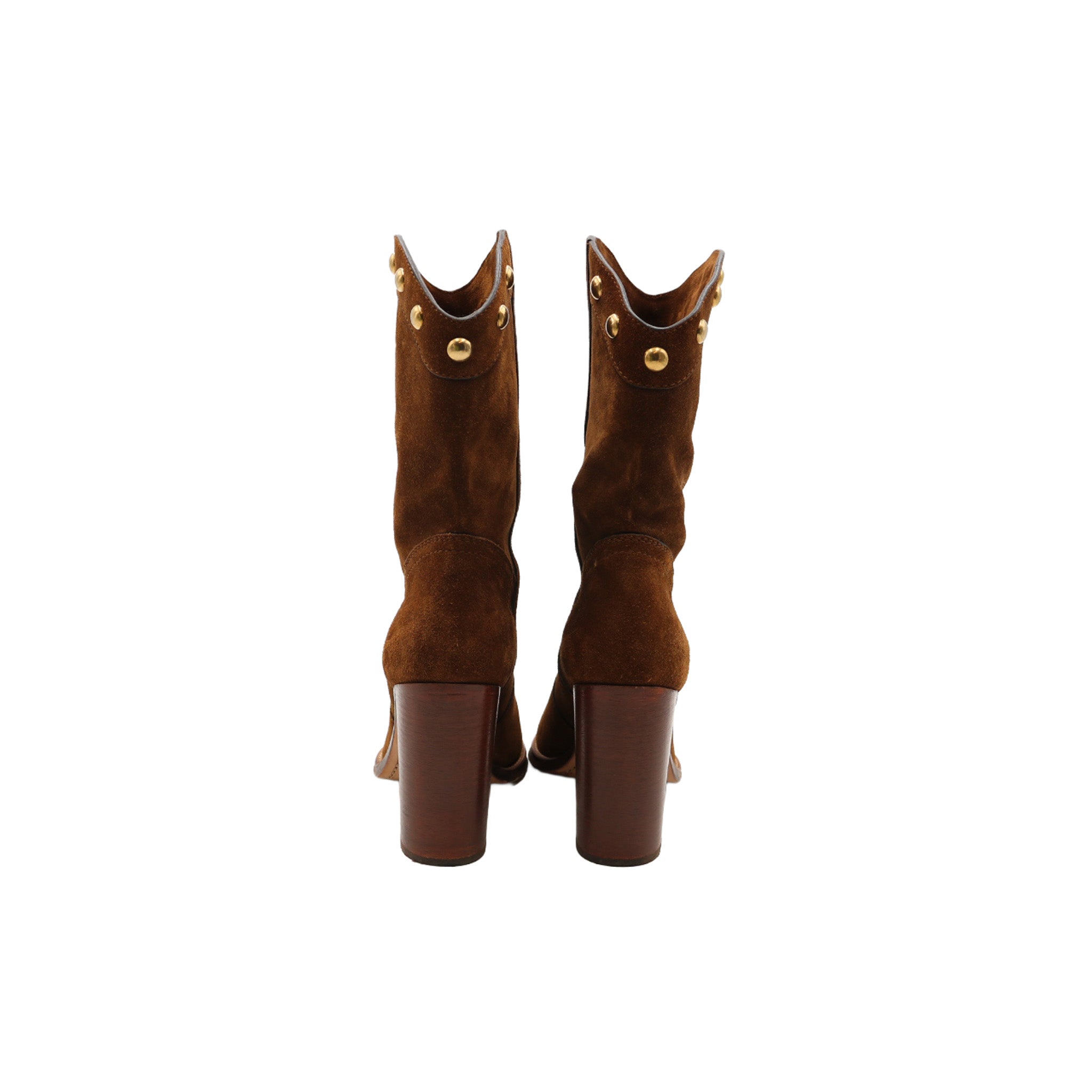 Bottes mi-mollet Saint Laurent en daim marron, au style western chic emblématique de la maison. Le modèle se distingue par une tige souple ornée de clous métalliques dorés disposés sur le haut de la botte, apportant une touche décorative élégante. La pointe est légèrement arrondie et le talon épais en bois assure stabilité et confort. Finitions soignées avec surpiqûres apparentes et semelle contrastante.